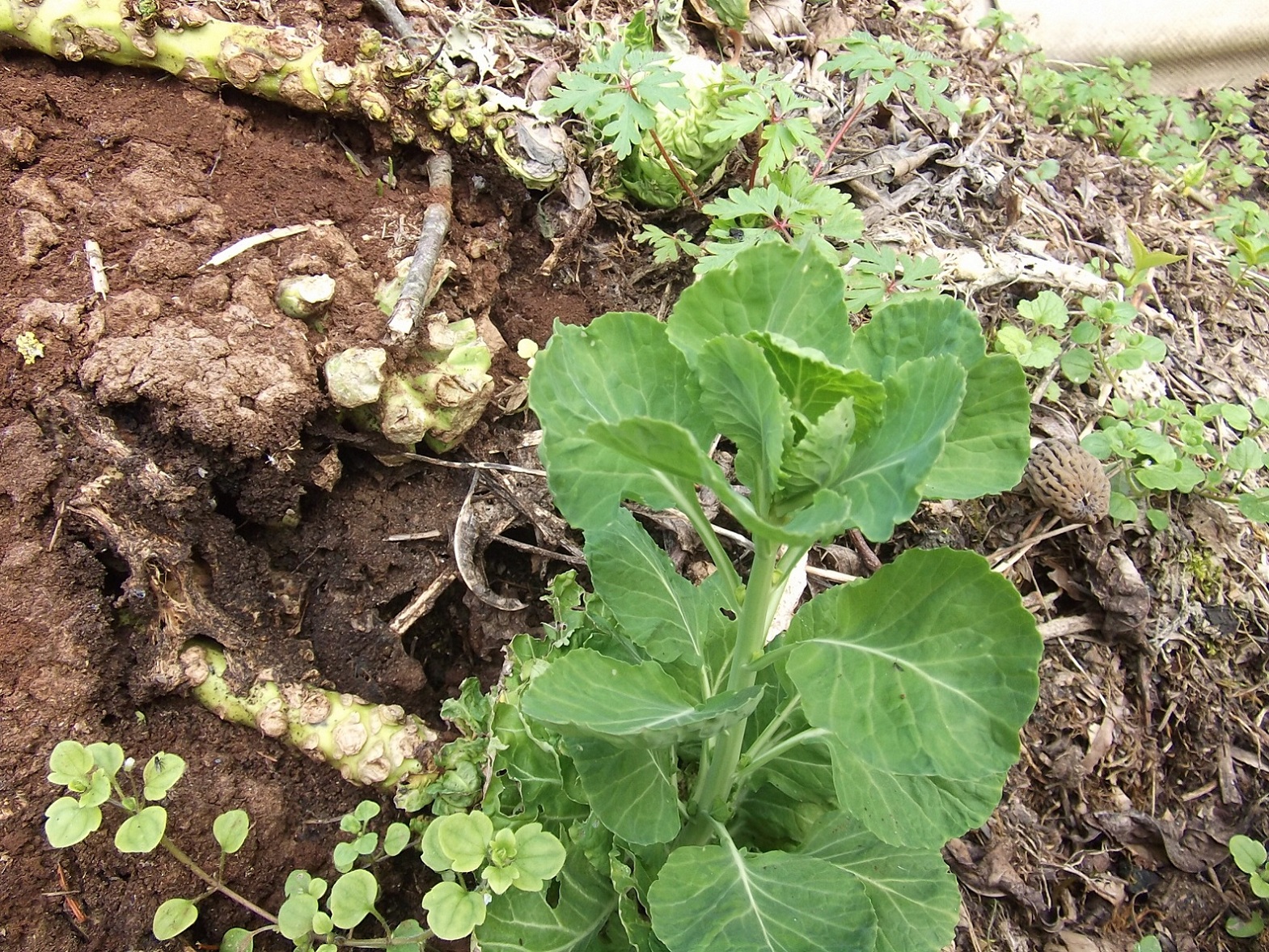 Les choux de Bruxelles que j'avais mis au composte ont fait de la résistance cet hiver.