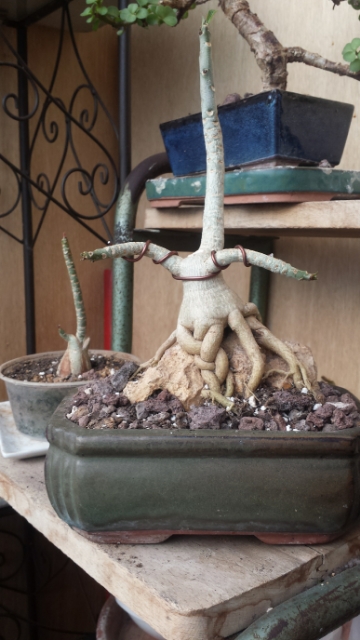 celui ci est un obesum , j ai fini le travail de racine sur la roche , cet été je m occupe du haut celui ci promet .... il se réveil deja et des ramifications pointent leurs nez ...c est un de mes préférés . Je l ai travaillé à la façon thaïlandaise ...et j ai surtout fait mes armes sur celui ci et sur celui qui va venir ...mon gros dodu ... la pierre en dessous commence à sortir de terre ... je travail la ramification cet été . Je le coupe tellement qu il n a jamais fleuri