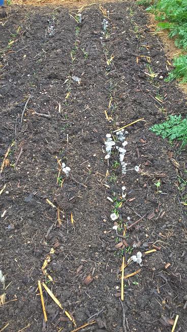 Les carottes semées il y a une semaines ont germées,mais ce matin,après l'orage de la nuit,des intrus sont venus tenir compagnie au précieuses racines