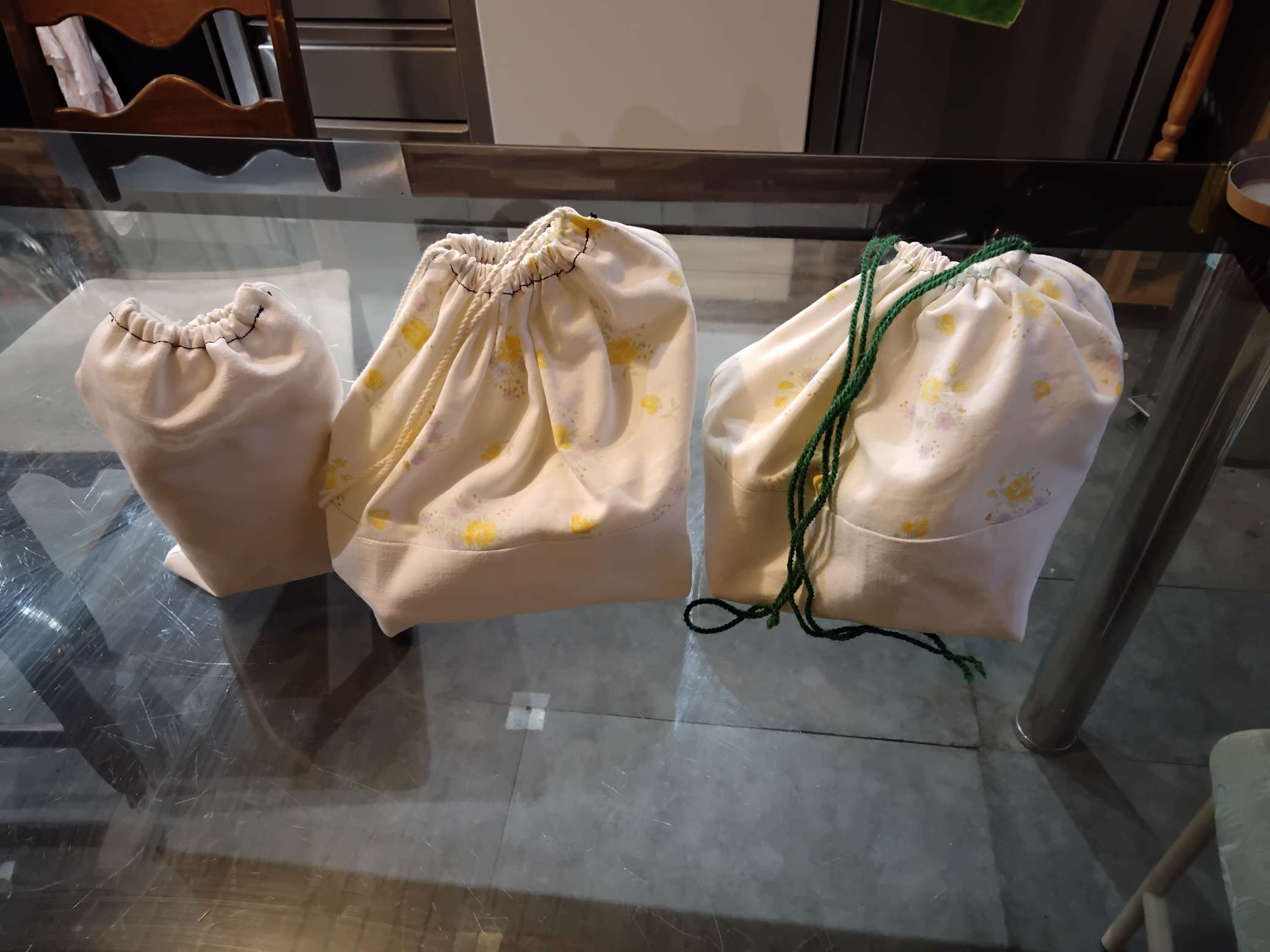 3 pochons avec tissus de récup : vieux draps et "toiles" qu'on m'a donnés.