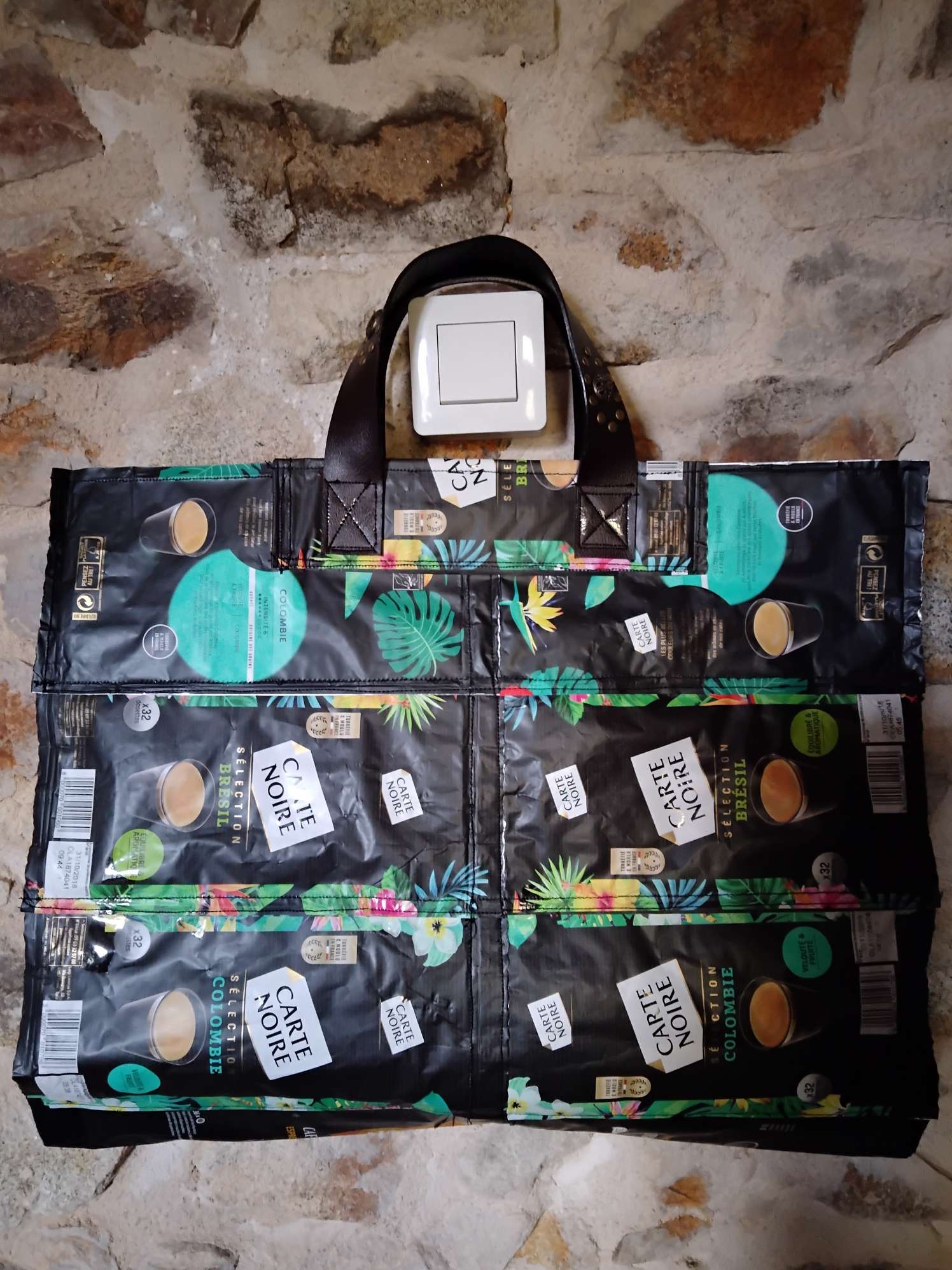 Donc j'en profite pour vous montrer aussi mon saccabuches(recyclage paquets de café et vieille ceinture)