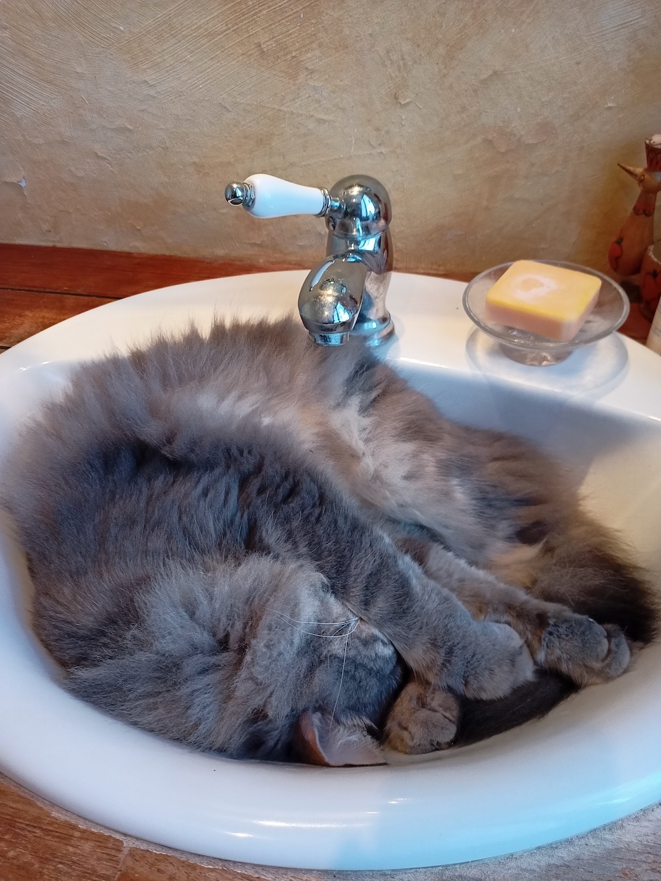 That is the question : que fait-elle ? Probablement rien ! Elle peut rester des heures ainsi, si quelqu'un entre qu'elle ne connaît pas on voit une espèce de serpent de poils qui rampe vers la sortie, elle déteste les inconnus, déteste les câlins, elle est dans sa bulle, belle et lointaine.