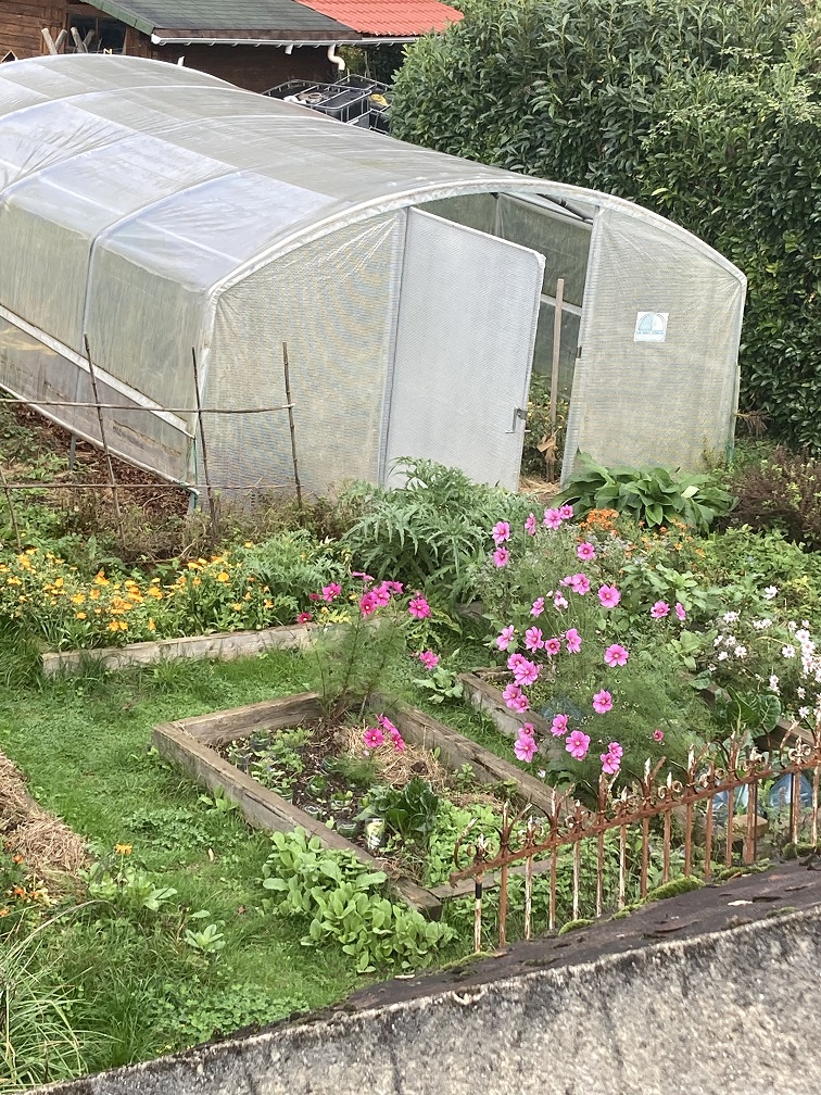 Elle est entourée de fouillis de fleurs en ce moment mais sous les fleurs poussent les blettes, salades,