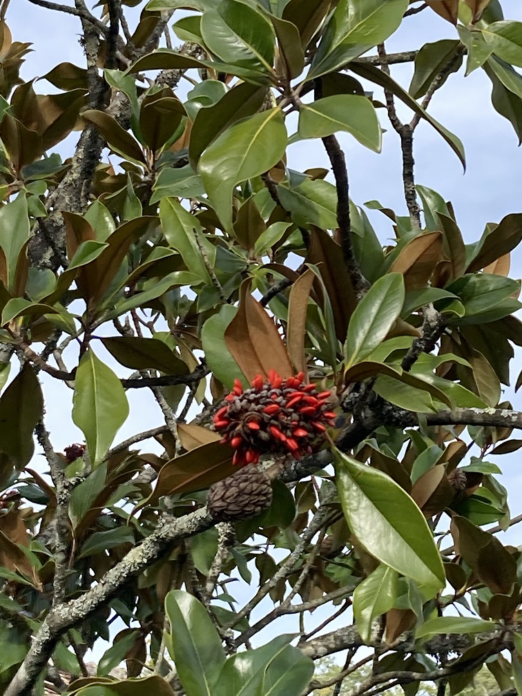et après la belle floraison de l'été, voici les pommes du magnolia avec les graines comme des perles