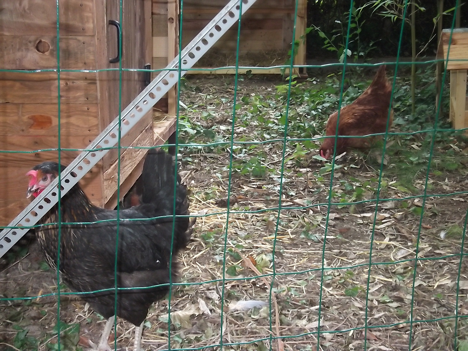 Tu parlais du chien....quand j'avais le labrador, j'avais été obligée de doubler le grillage de l'enclos avec du grillage en panneaux rigides, sinon, un coup de tête et il allait se goinfrer de caca de poules