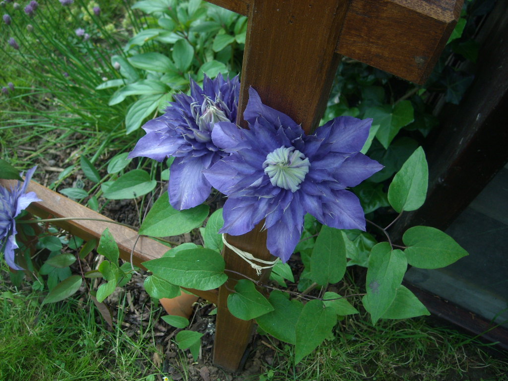 tout juste sur le côté la pergola fraichement installée, rose David Austin (pas encore éclose) et clématite