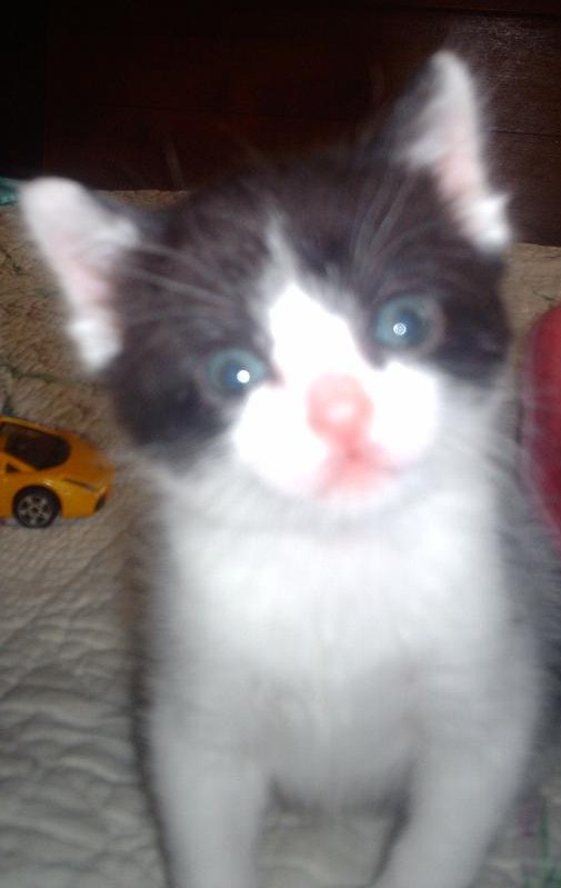 Eclair va très bien, en pleine forme. Il dort de moins en moins et joue souvent. On ne se quitte plus. Pour notre plaisir, voici une photo d'Eclair :
