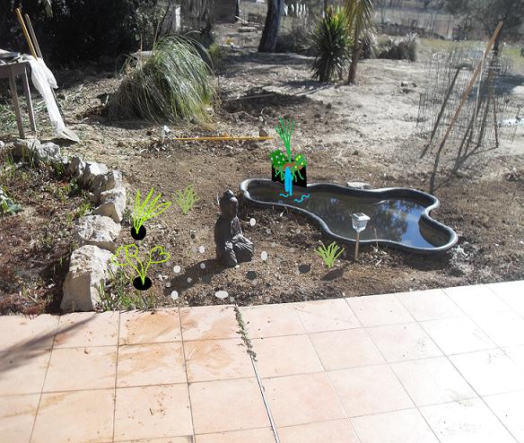 je pense aussi mettre une pompe solaire histoire d'animer la surface de l'eau. le soleil tape un bon moment toute l'année donc ça devrait le faire.