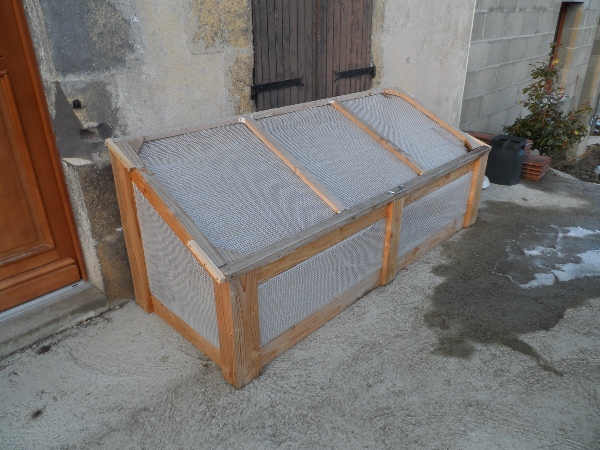 Quelques photo du châssis que j'ai bricolé l'année dernière avec des planches de récupération et de la bâche renforcée. Il fait environ 2 mètre / 80 cm. Si je le rempli de plants, j'aurais de quoi faire