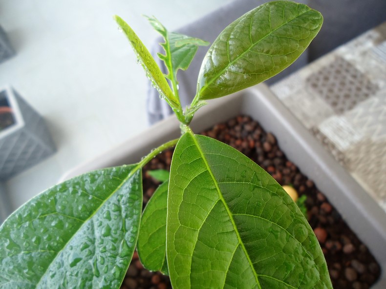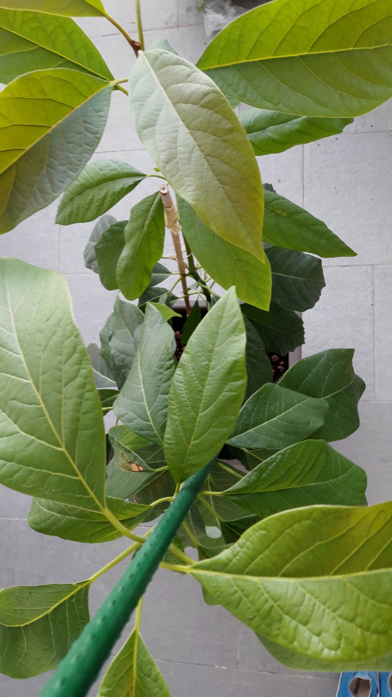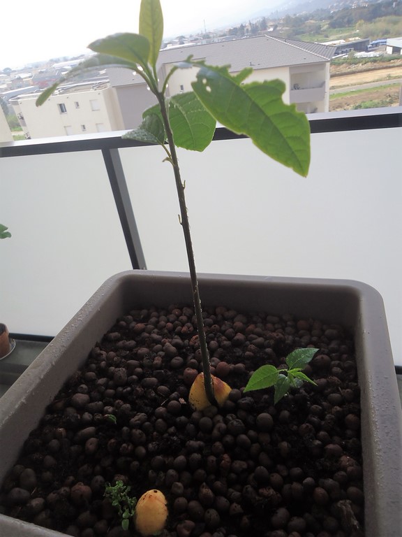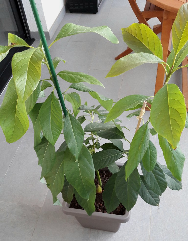 L'avocatier a très bien grandi depuis. Le tronc commence à sinstaller pour le plaisir de nos yeux :D =