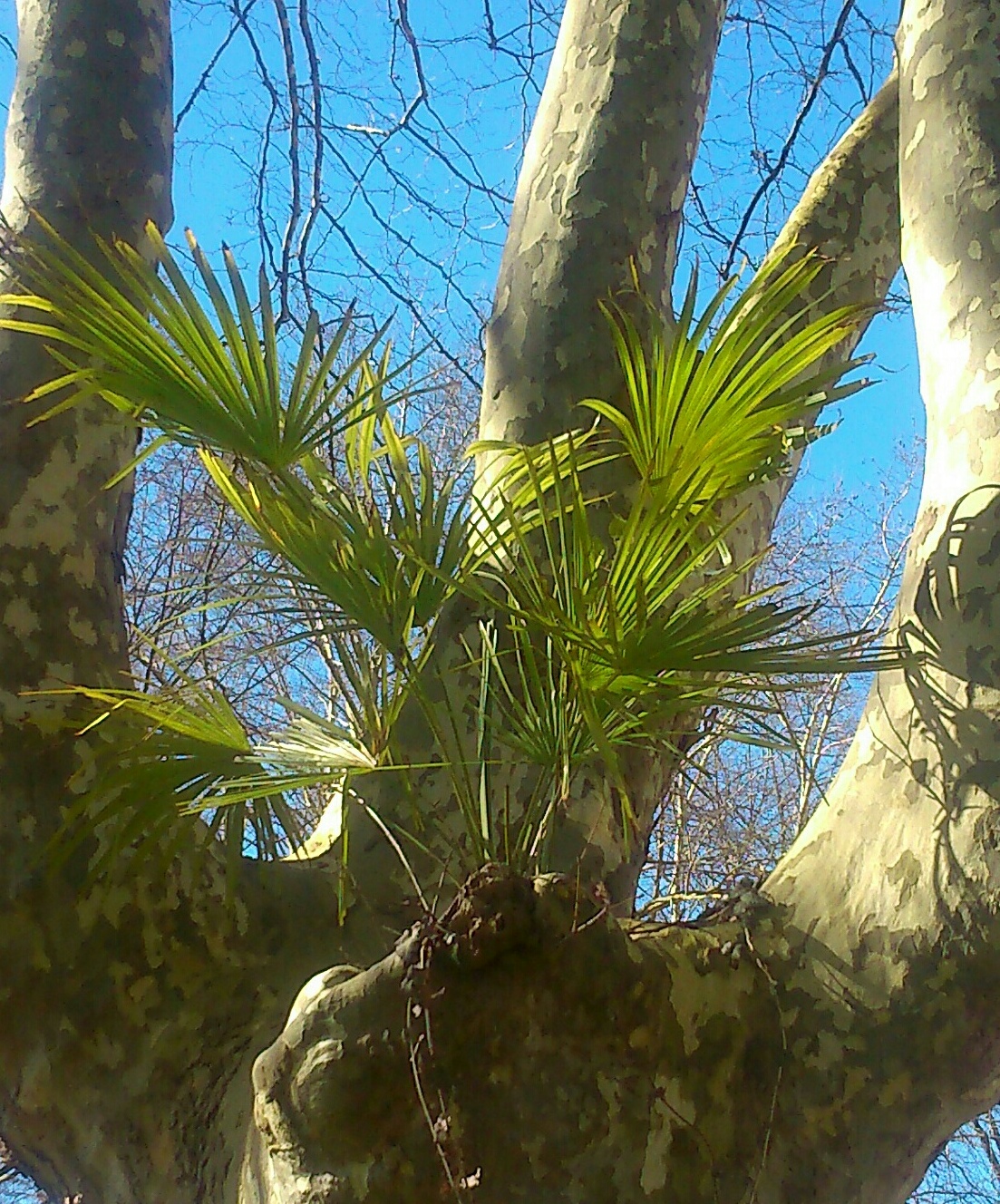 Je l'avais déjà croisé l'année dernière mais je ne crois pas que je l'avais posté, c'est un palmier qui pousse au coeur des branches d'un arbre, je me demande s'il va pouvoir se développer ?