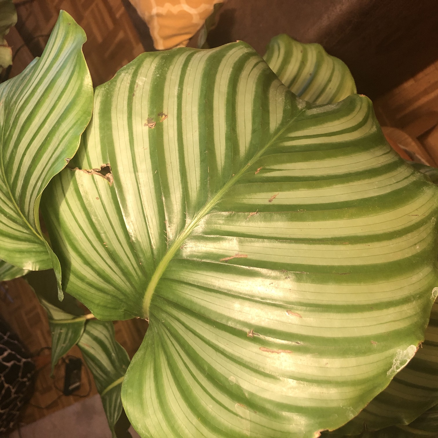 Toute débutante, j'ai un calathéa orbifolia depuis 2 mois (oui, je ne savais pas que les calathéas étaient des plantes si "difficiles") et il faisait ma fierté (voir la photo 1 !) jusqu'il y a quelques jours où des traces marrons sont subitement apparues (voir photos 2 à 6), très sèches sur les feuilles, aussi bien vieilles que toutes jeunes... Ca a été très soudain, et assez fort.