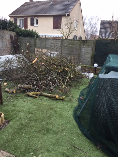 puisque toutes les feuilles sont en bout de branches j'ai tout liquidé en copeaux sur 3 heures de la semaine et les tailles du lilas y sont passées aussi du coup reste juste les grosses branches que je donne à mon voisin pour la cheminée