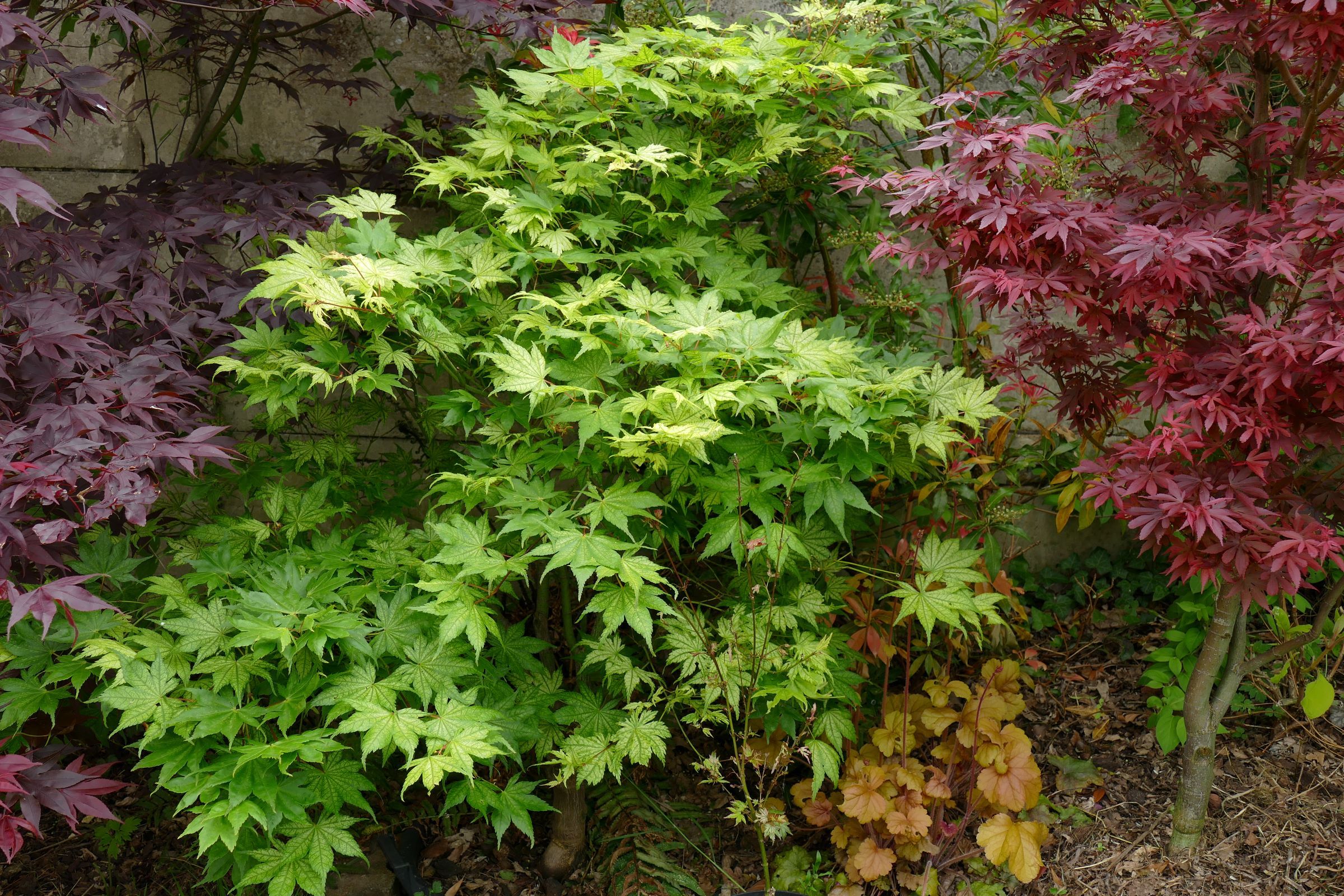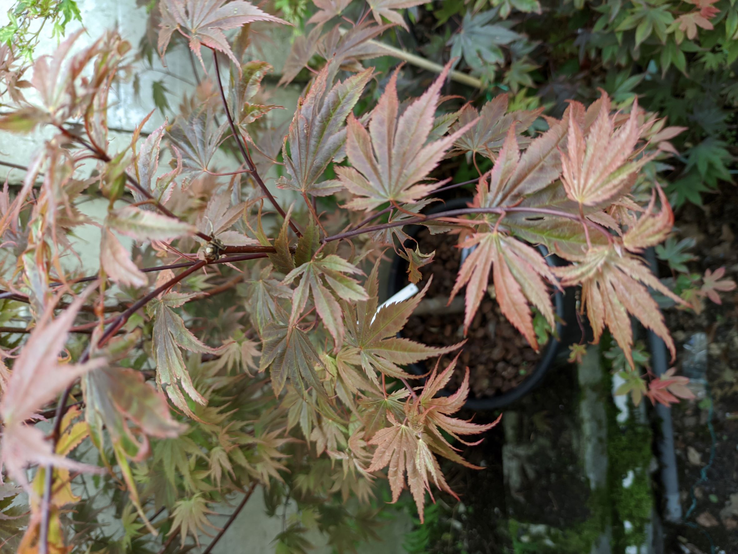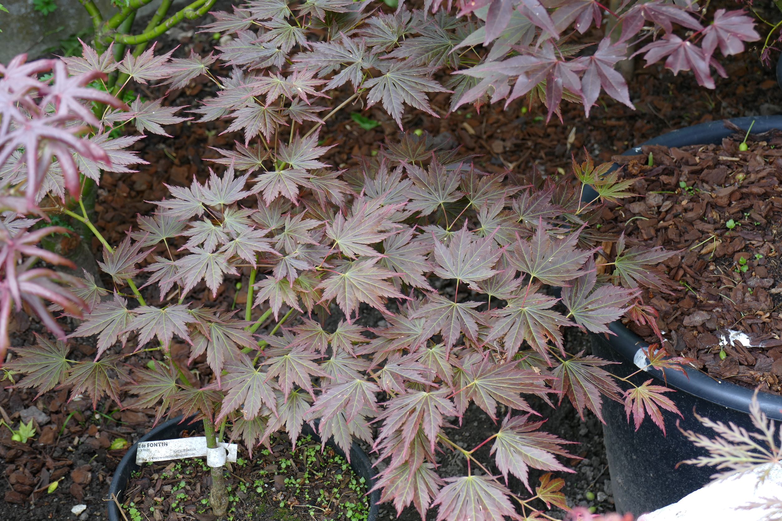 oui, il y a moins d'une heure : j'ai retiré un beau 'katsura', qui a gelé sur la moitié haute de sa ramure, il est dans un container et va se refaire une beauté en serre pendant au moins 2 ans, à la place j'ai mis 'emerald lace', et j'ai déplacé le petit purple ghost'.
