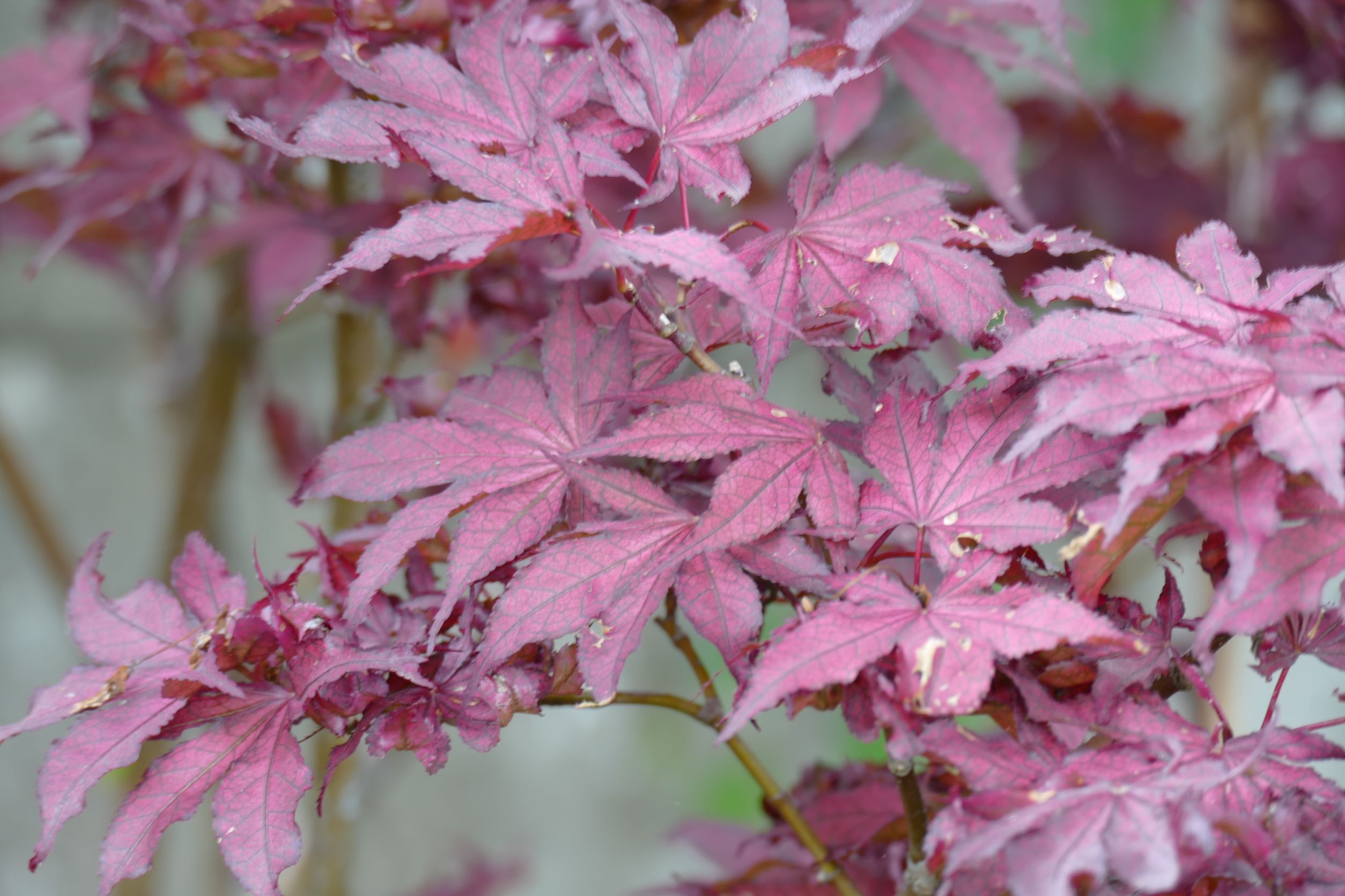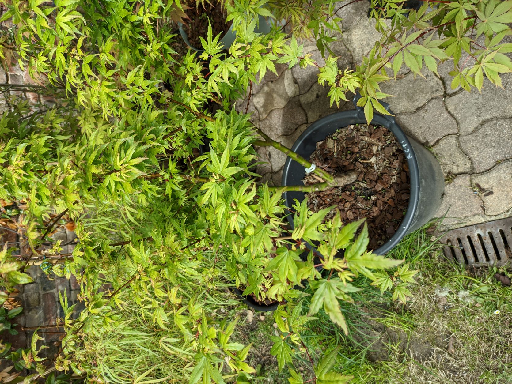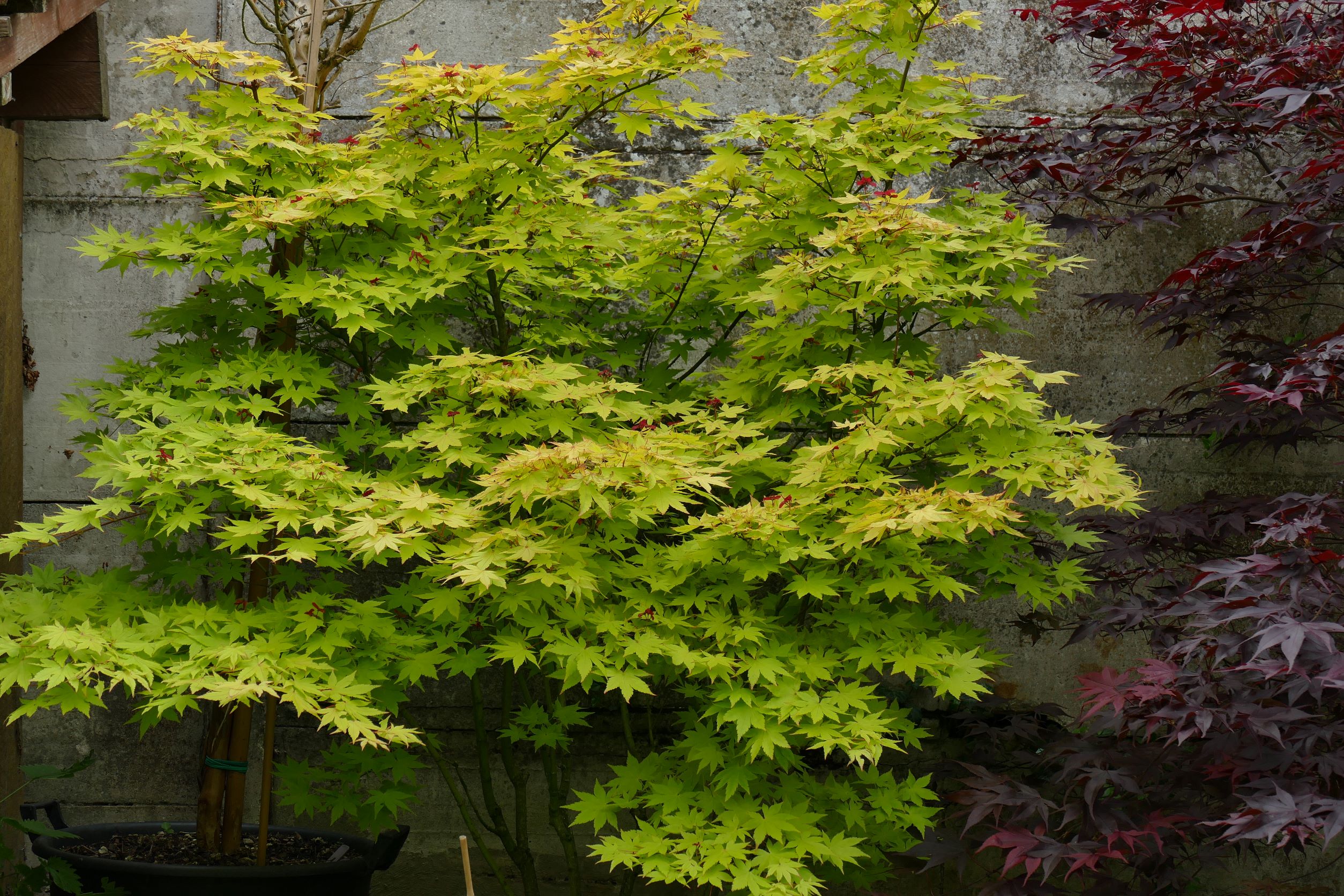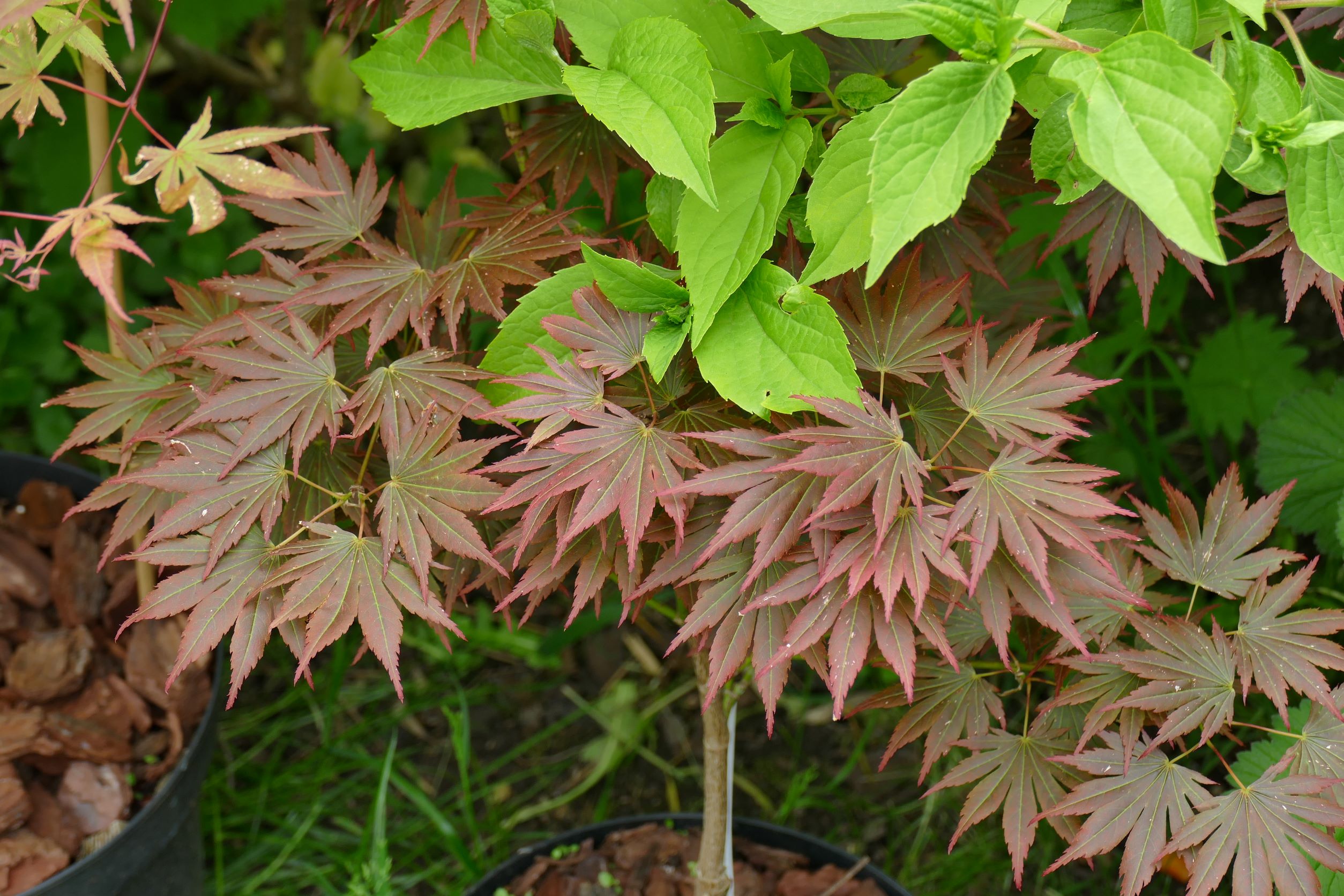 oui, il y a moins d'une heure : j'ai retiré un beau 'katsura', qui a gelé sur la moitié haute de sa ramure, il est dans un container et va se refaire une beauté en serre pendant au moins 2 ans, à la place j'ai mis 'emerald lace', et j'ai déplacé le petit purple ghost'.