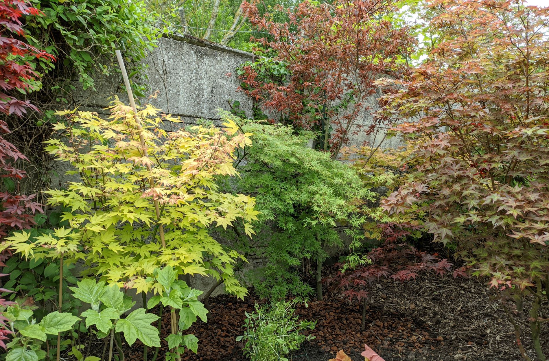 une photo du massif que je viens de terminer. De gauche à droite : 'orange dream', 'emerald lace', 'beni hagoromo', le plus petit de mes 'purple ghost' (au sol), derrière lui shira 'autumn moon', 'deshojo'.