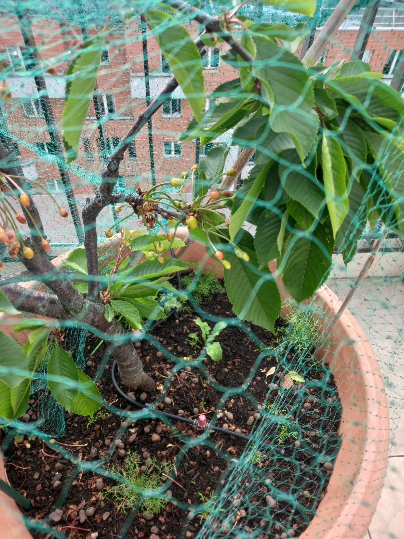 Pour le cerisier ça a été une vraie galère pour le poser..du bricolage en mettant des tuteurs dans des pots de plantes et en étirant filet au dessus du cerisier...