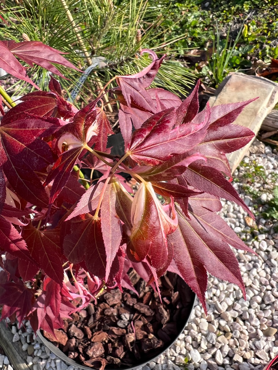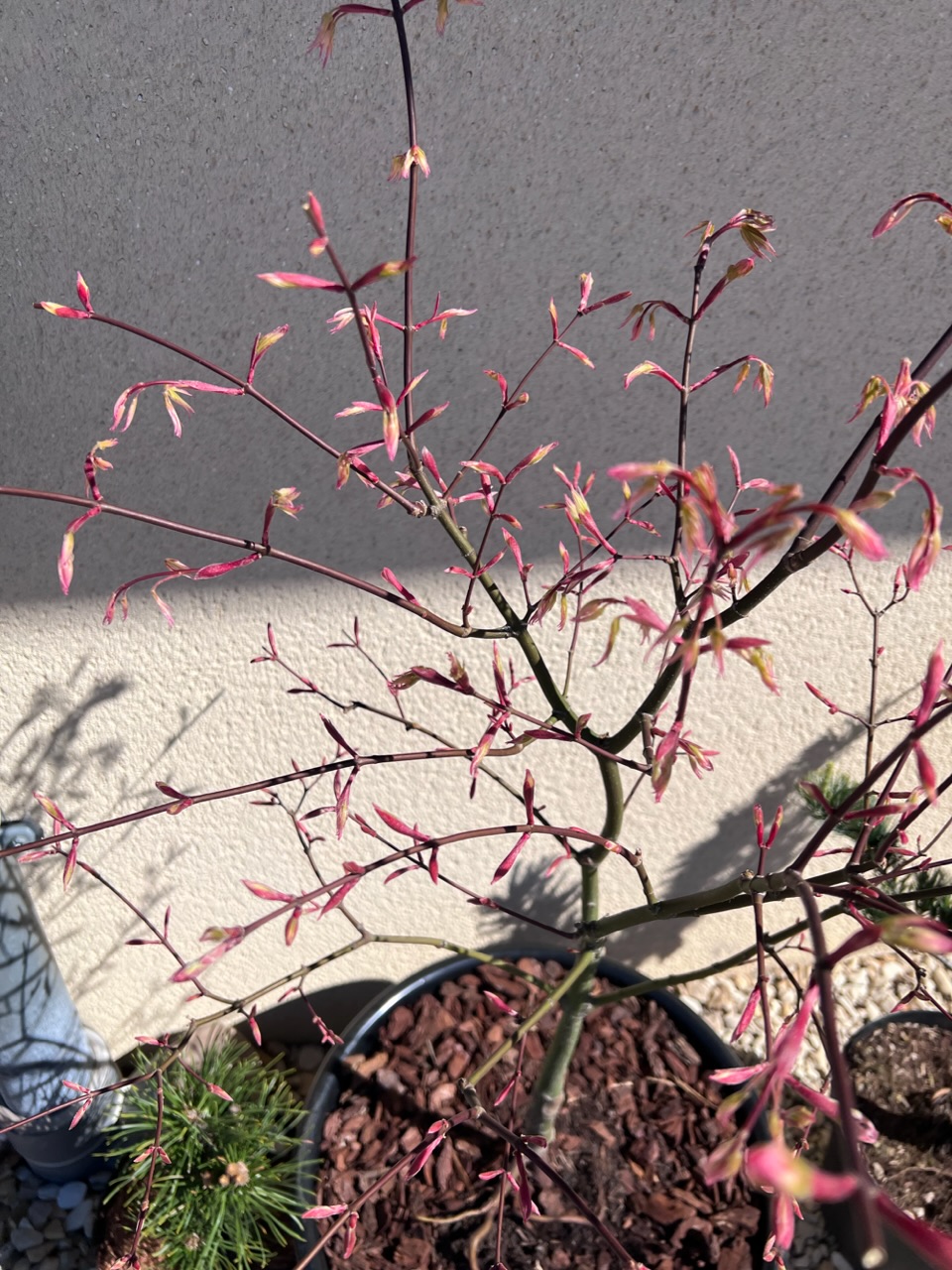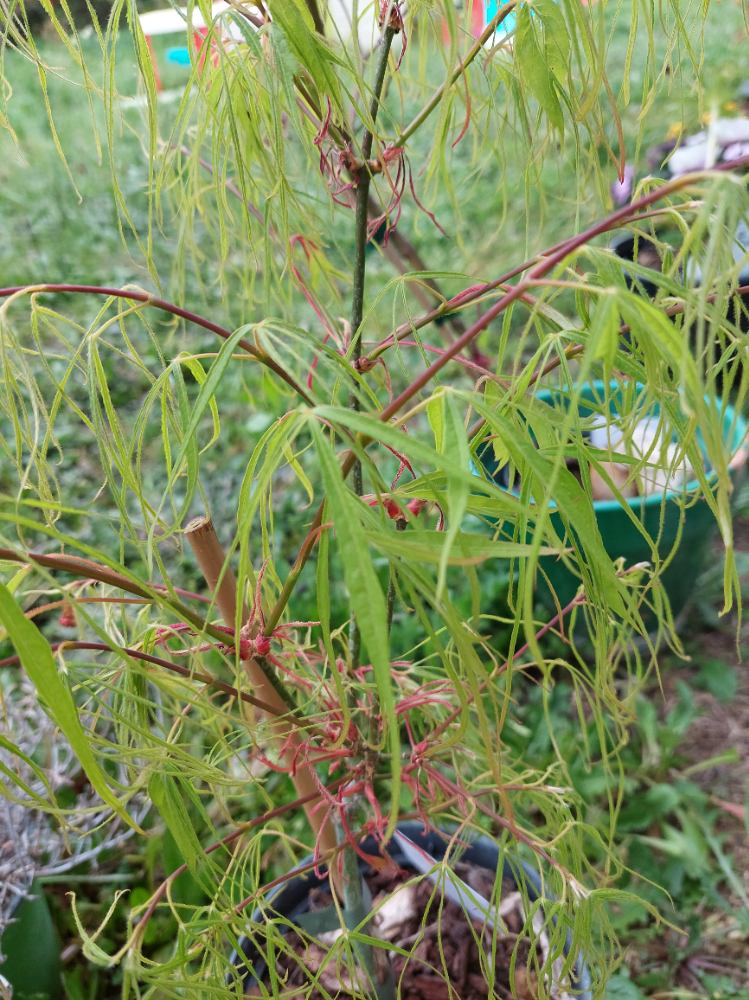 L'année dernière j'ai planté un katsura devant la haie de thuyas (afin de l'égayer et qu'il cache un vis à vis plus en hauteur), à coté d'un voisin noisetier qui lui donne de l'ombre en été. C'est une terre rempli de remblais dégoutant (je sors tout et n'importe quoi dès que je creuse un trou ça me déprime :'( ) mais j'ai tenté, Il a bien pris (il a bien tenu la sècheresse 2022 également) et il se prépare pour cette année <3 Mon 1er érable, mr Bloodgood <3 Lui il a déménagé plusieurs fois pour finir devant la fenêtre de la chambre ou je le vois au réveil ^^ sol sableux (à priori l'endroit ou devait être fait le béton), un peu plus de terre mais entouré de remblais aussi (l'herbe pousse d'ailleurs très peu autour tellement y'a rien dans le sol) :/ Il a aussi bien grandi, j'aimerais le faire pousser en arbre pour pouvoir continuer à passer un véhicule derrière si besoin. Là il doit faire 1m -1m20. Mon préféré, il a supporté la sécheresse 2022 plein soleil sans soucis, un warrior ! Je lui ai coupé pour la 1ere fois les 2 branches du bas il y a peu (c'était pas facilen du coup j'essaye 2-3 boutures