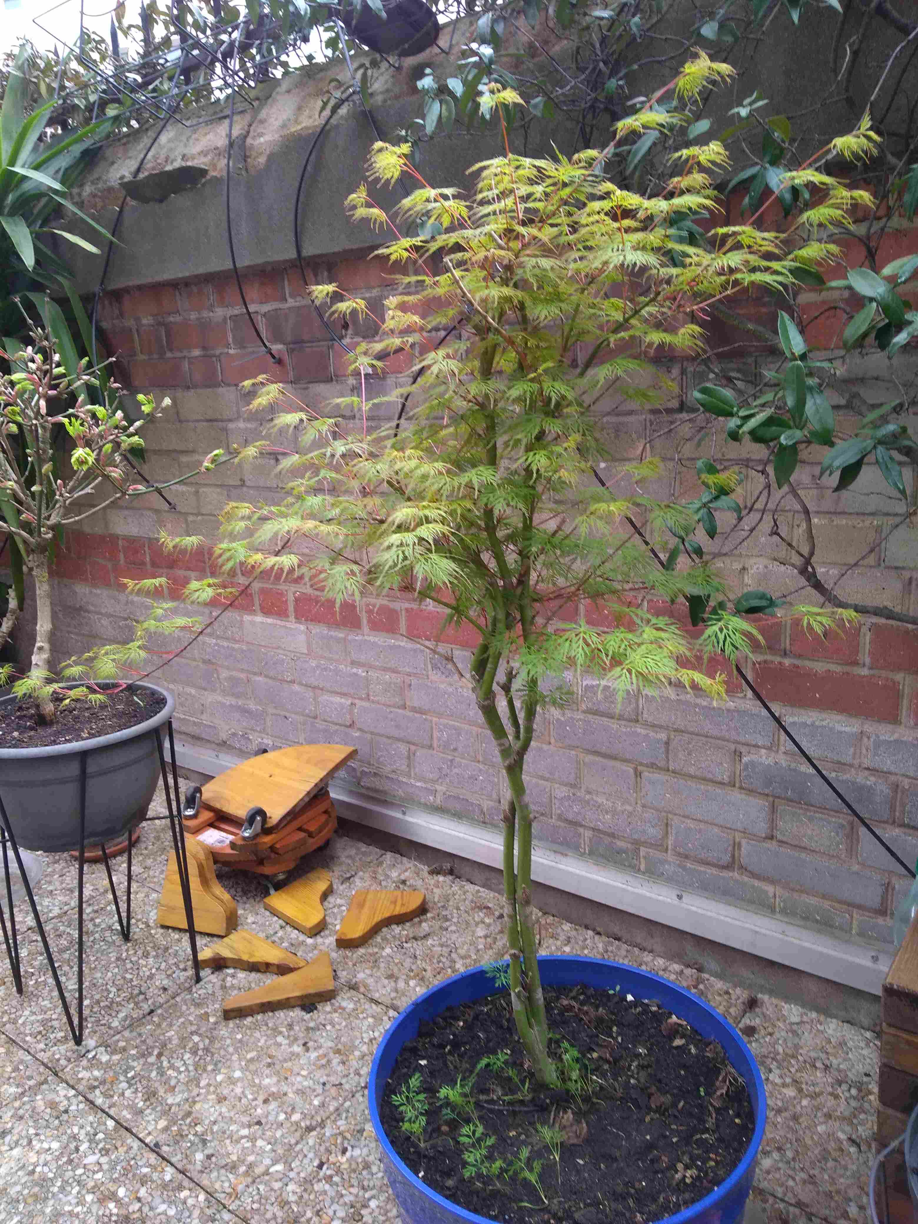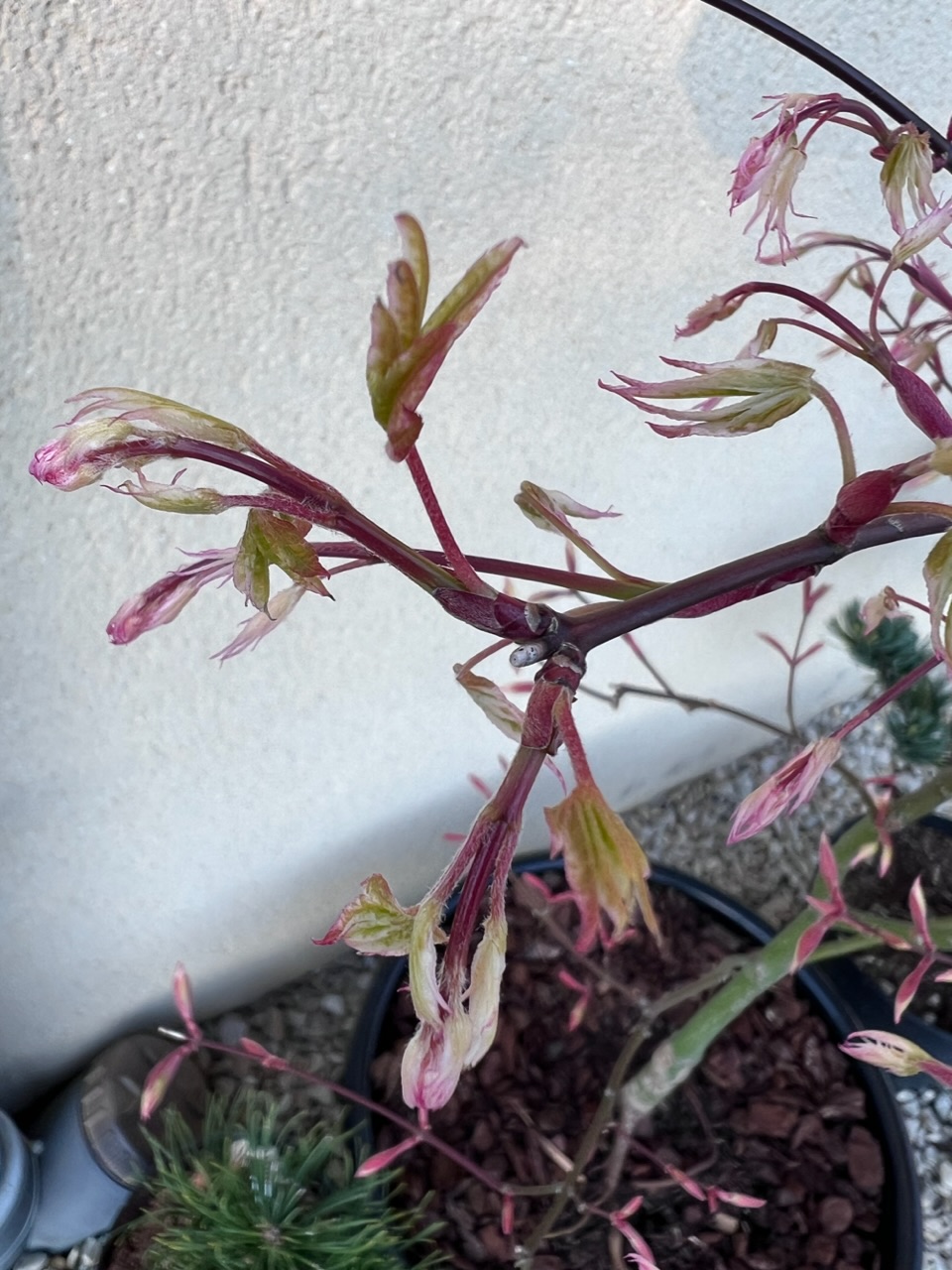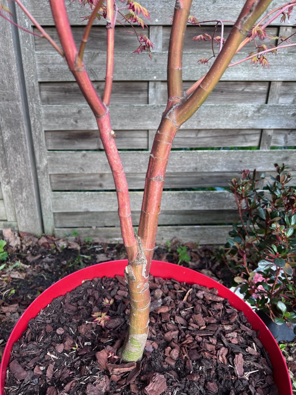 L'année dernière j'ai planté un katsura devant la haie de thuyas (afin de l'égayer et qu'il cache un vis à vis plus en hauteur), à coté d'un voisin noisetier qui lui donne de l'ombre en été. C'est une terre rempli de remblais dégoutant (je sors tout et n'importe quoi dès que je creuse un trou ça me déprime :'( ) mais j'ai tenté, Il a bien pris (il a bien tenu la sècheresse 2022 également) et il se prépare pour cette année <3 Mon 1er érable, mr Bloodgood <3 Lui il a déménagé plusieurs fois pour finir devant la fenêtre de la chambre ou je le vois au réveil ^^ sol sableux (à priori l'endroit ou devait être fait le béton), un peu plus de terre mais entouré de remblais aussi (l'herbe pousse d'ailleurs très peu autour tellement y'a rien dans le sol) :/ Il a aussi bien grandi, j'aimerais le faire pousser en arbre pour pouvoir continuer à passer un véhicule derrière si besoin. Là il doit faire 1m -1m20. Mon préféré, il a supporté la sécheresse 2022 plein soleil sans soucis, un warrior ! Je lui ai coupé pour la 1ere fois les 2 branches du bas il y a peu (c'était pas facilen du coup j'essaye 2-3 boutures
