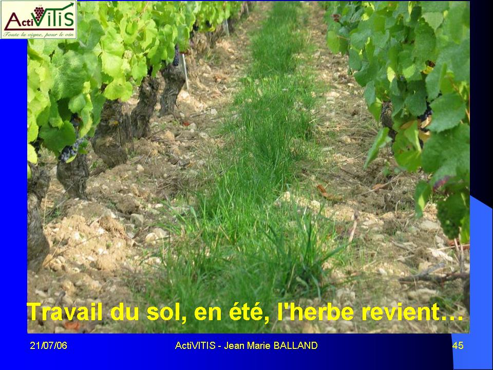 je vie au milieu d'un vignoble, l'enherbage des vignes a été une mode qui est vite passée. Actuellement deux tendances se dessinent, l'enherbage partiel (le milieu des rangs avec les ceps dégagés) et le travail de la terre total.