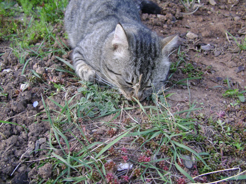 Je vais guetté mon chat dans le jardin. Je l'ai surpris se frottant voluptueusement le museau sur les 1ères pousses d'un népéta. J'ai regretté de ne pas avoir de piles dans mon appareil. Le népéta a pas trop aimé lui...