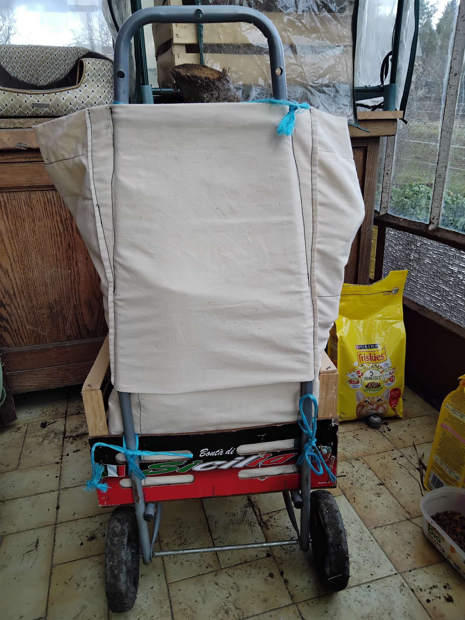 J'ai enfin terminé mon projet couture pour rénover le "chariot à bois" (qui est en fait un caddie de courses).