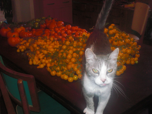 Une photo de Moumoune devant une partie de ma récolte de tomates!!