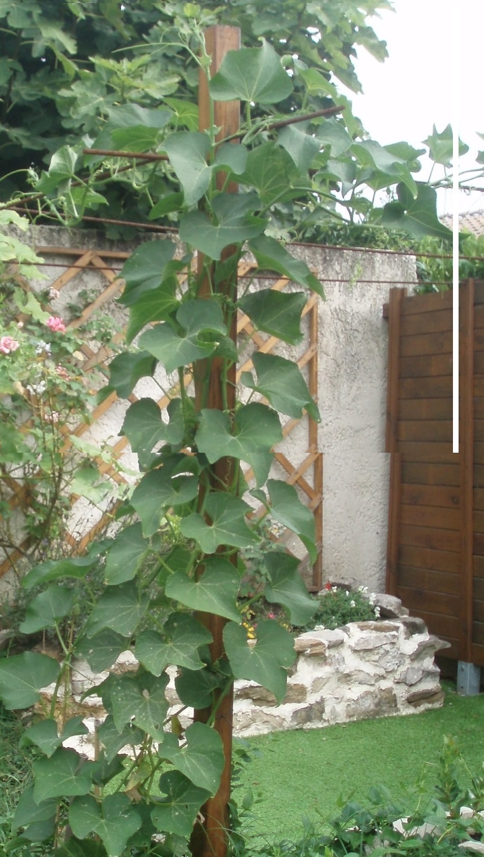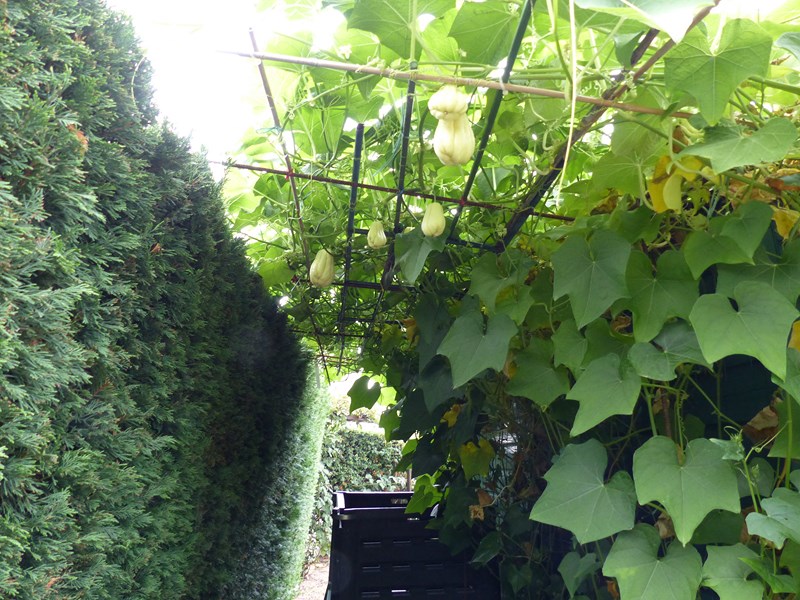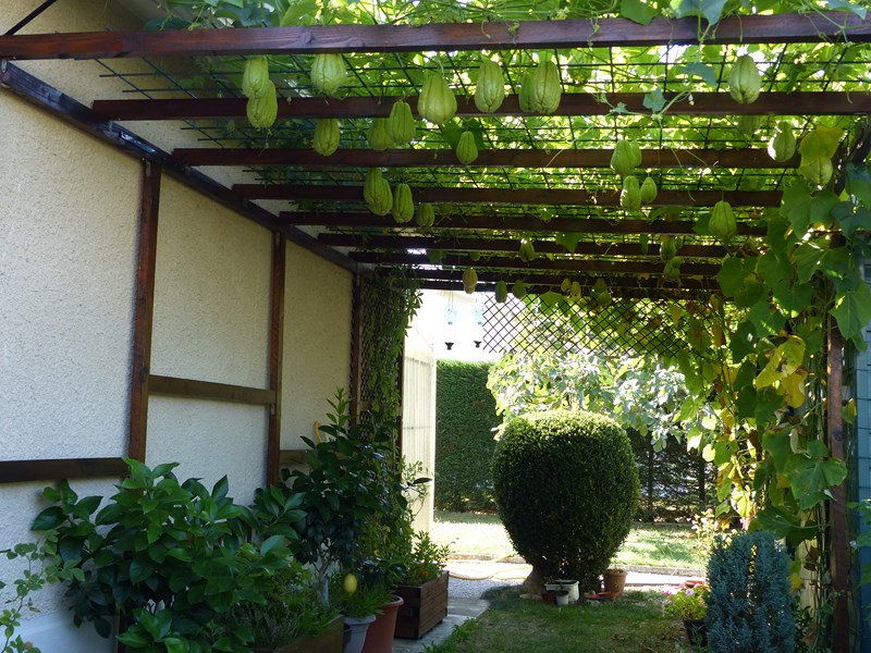 Au mois d'avril j'ai mis à germer en pot, dans ma véranda, une christophine achetée en supermarché. Elle a rapidement fait des lianes et je l'ai repiqué en pleine terre début juin. Après avoir un peu végétée, son développement s'est accéléré à la mi-août. Il y a trois lianes d'environ 3m chacune.