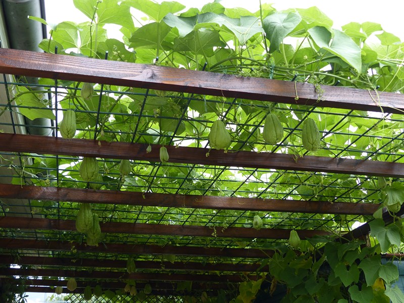 Les lianes continuent de pousser et sont super envahissantes cette année. Elles passent du support sur le toit et je commence à avoir du mal à ramener tout ça vers le support.