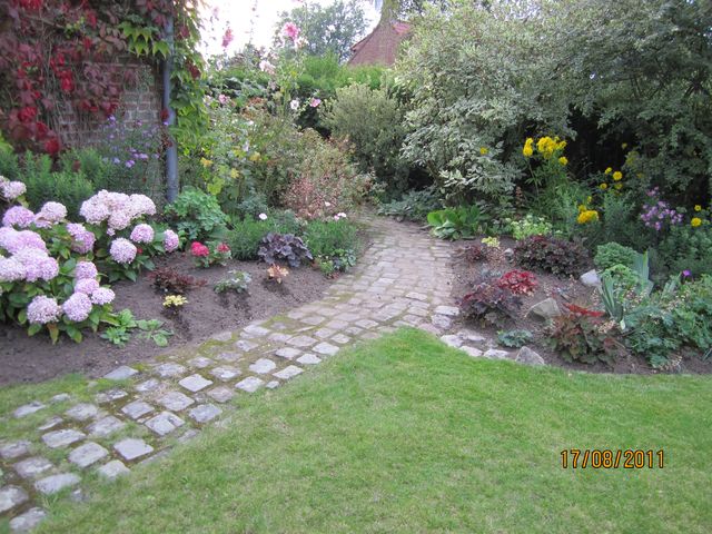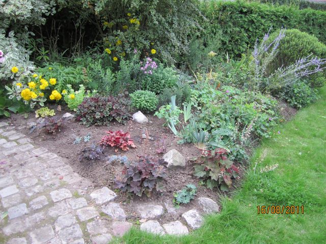 Bonsoir. Voici les dernières photos prises ce soir après un gros travail de " remise en état. vous verrez ce qui résulte des 2 massifs d'heucheras par_s moultes tergiversations. c'est décidé . Je garde , encore une fois j'ai déshabillé <pal pour habiller Pierre mais c'est mieux ainsi.