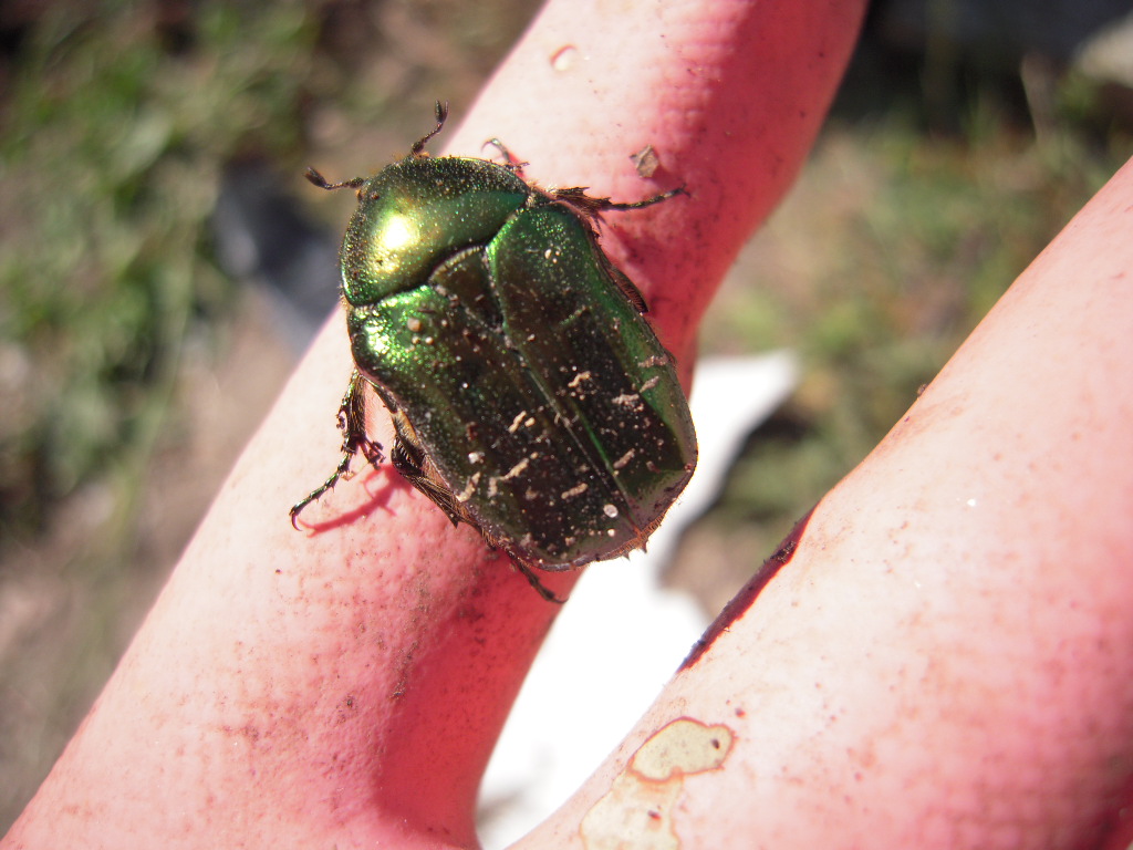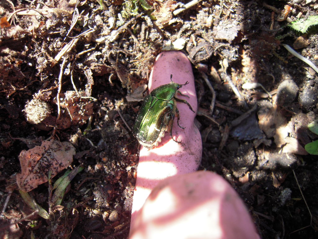 Ce matin, j'ai replanté 3 framboisiers. J'ai trouvé un cétoine imago, que je pensais mort, tout desséché et immobile. Finalement j'ai distingué que ses antennes bougeaient un peu. Je pense qu'il venait d'émerger. Je l'ai remis sur du terreau. Un peu plus tard, j'ai pu constaté qu'il était bien vivant. J'ai filmé son premier envol.