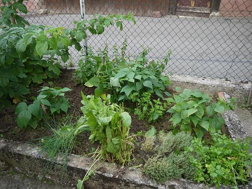 le jardin petits fruits et fleurs devant (pas beaucoup de fleur : le liseron envahit tout)