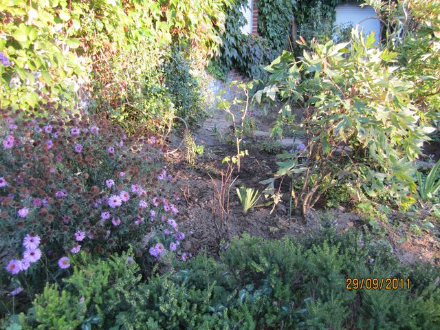 Me revoila je demande de l'aide et oublie la photo . On y devine les iris sauvés,une daphne transplantée, une pivoine herbacée sauvée in extremis. on devine le feuillage des pivoines arbustives non touchées. Merci de m'aider à " meubler de coin. Il y a des géraniums vivaces sauvés dont on devine à peine l'emplacement ayant été enterrés je les ressors lentement .J'ai perdu énormément de bulbes et toutes les primevères.