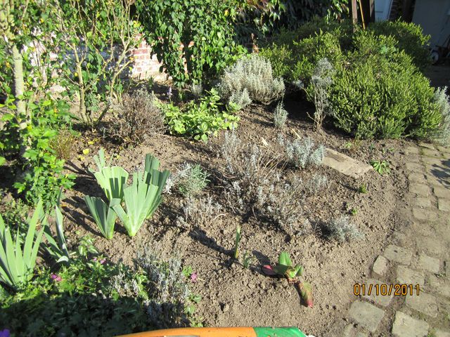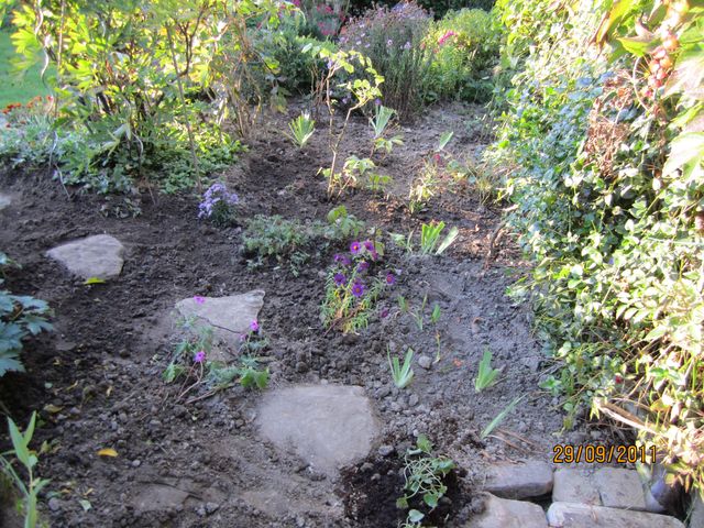 part belle aux asters, aux géraniums vivaces, ai mis des iris d'une manière bien particulière et ai piqué deux arbustes dans un autre massif ! les bulbes seront placés samedi dans les trous visibles !