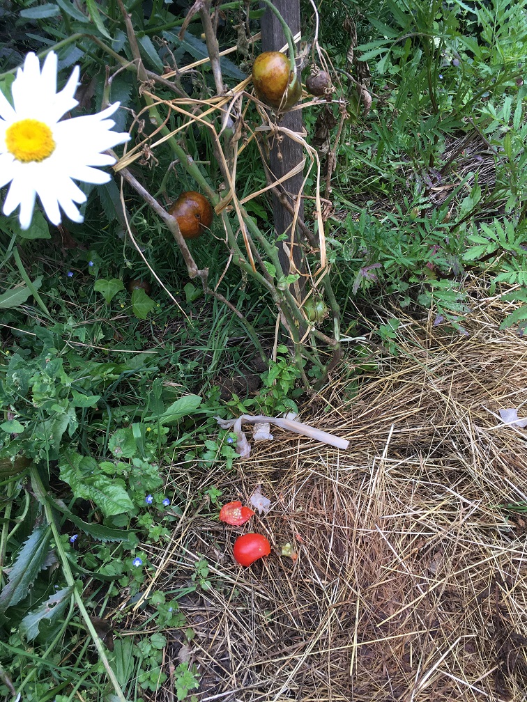 Voilà ce plant qui avait qq tomates rouges à la base et un animal est venu