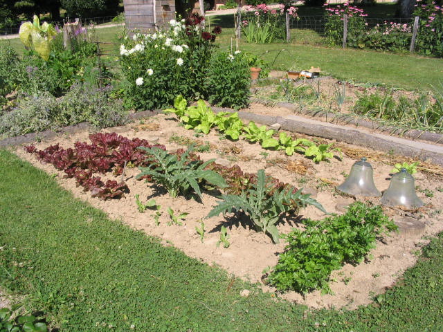 non je n'ai pas d'artichaut ! au milieu avec le blanc ce sont des dahlias... et à côté le carré fruits avec les concombres, tomates ect...