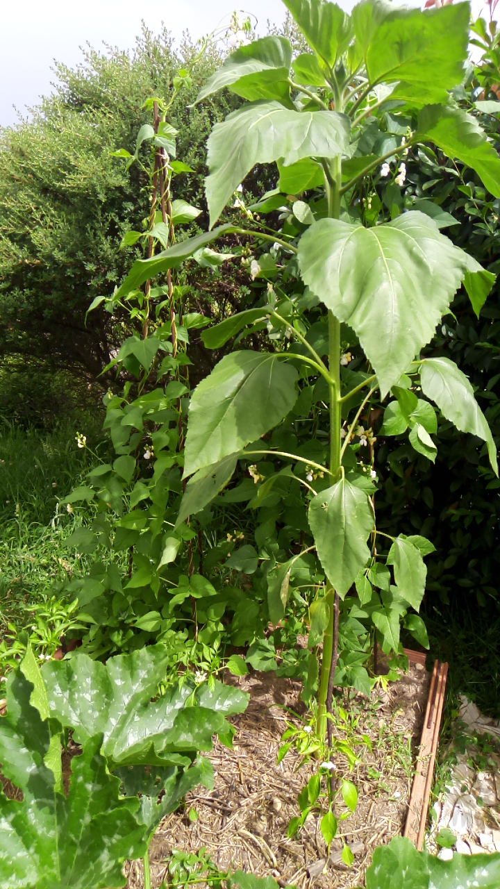 Superbe évolution, bien vert tout ça ! Tu n'as pas été tentée de faire monter des haricots à rames sur ton tournesol ?