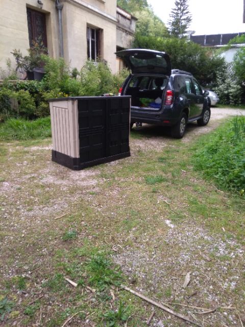 petite balade avant la pluie, j'ai acheté ce coffre qui va remplacer mon poulailler : tout en plastique il sera facile à nettoyer