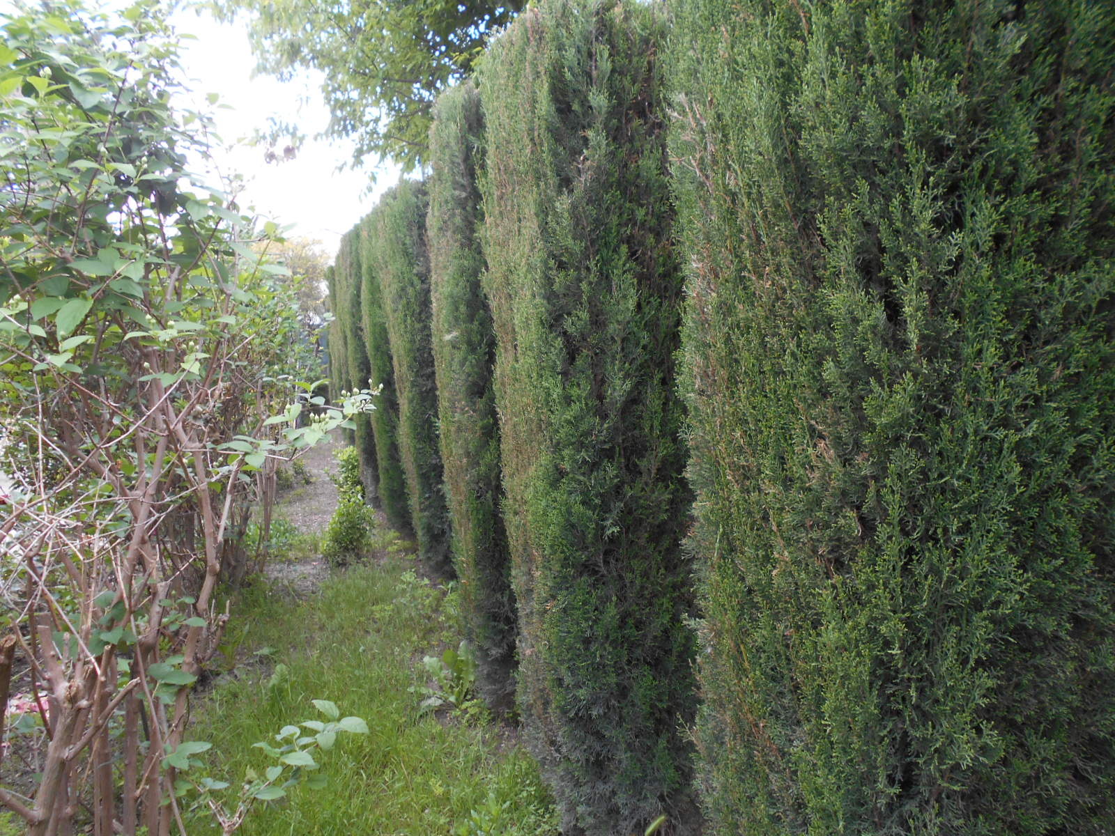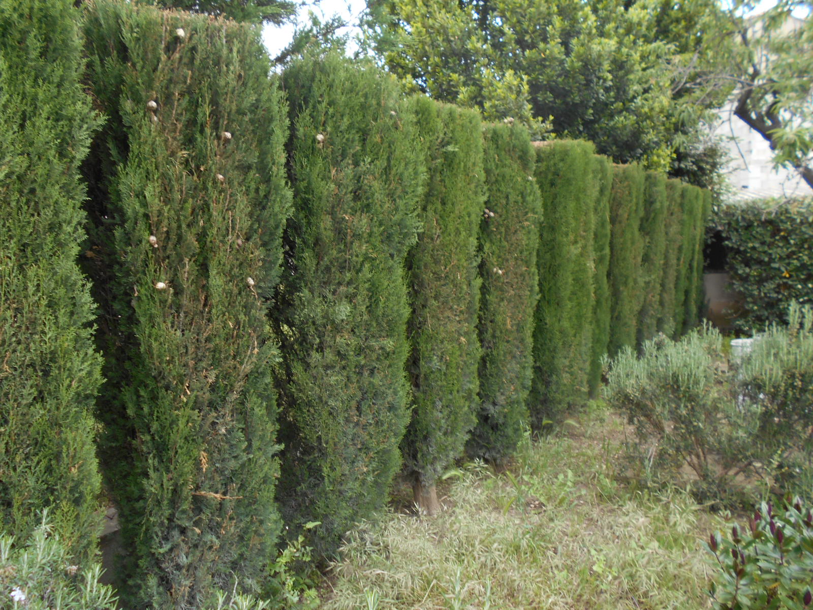 voici mes cyprès taillés ce n'est qu'un seul côté du jardin .
