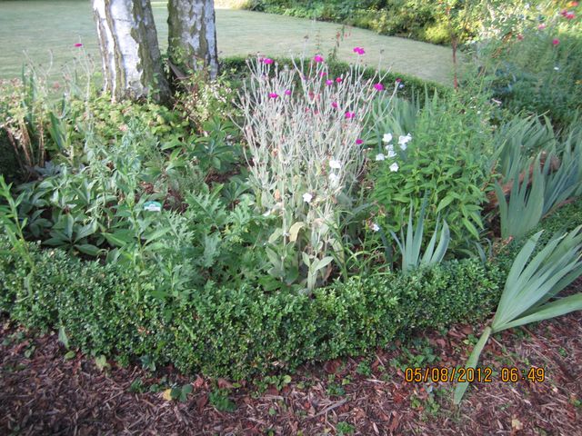 Je me suis servi de la circonférence marquée au sol par un manque de vegetation et ai planté des buis sur le tracé ! les plantes se sont mises au fur et à mesure de mes envies ,je'ylaisse, entre autres courir une clématite texensis mais les lychnis sont le cadeau des oiseaux je les ai laissés !!. on agira après !. Bonne journée si tout va bien je continue le nettoyage etc.. .. du jardin de l'entrée.