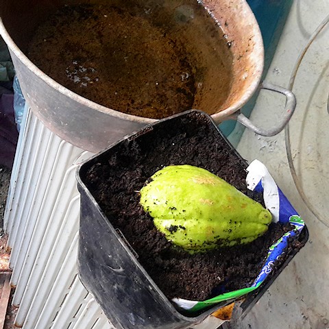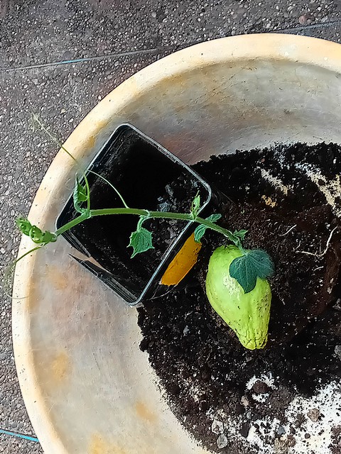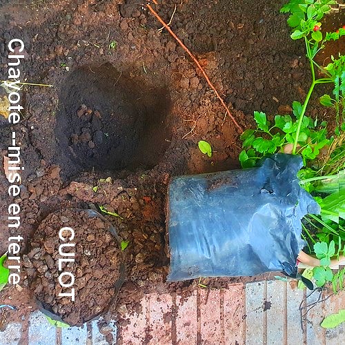 Ajour hui avais installé en pleine terre mon jeune plant christophine cultivé dans un sac plastique: