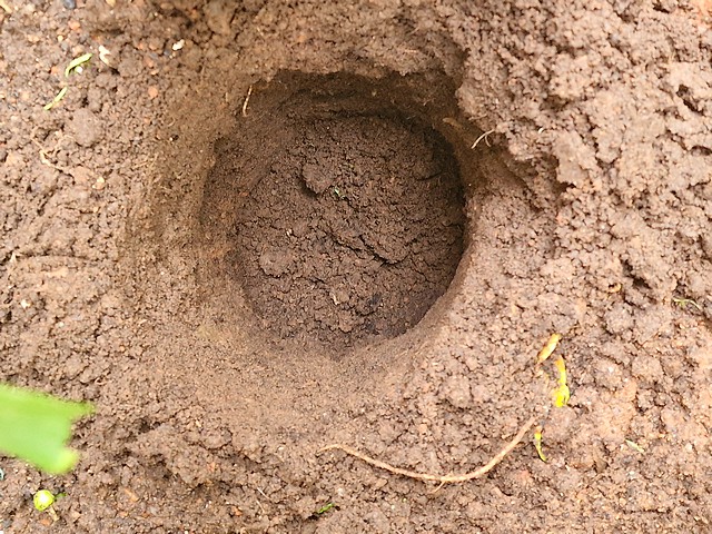 Après avoir retiré le culot du sac plastique, j avais installé confortablement ce dernier dans le trou de plantation. A l issue, j avais retiré le reste du sac en forme de cylindre, puis j avais comble le trou avec du substrat enrichi.