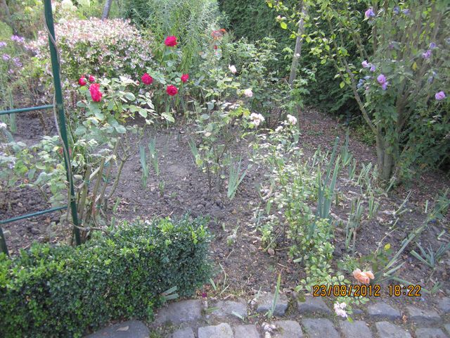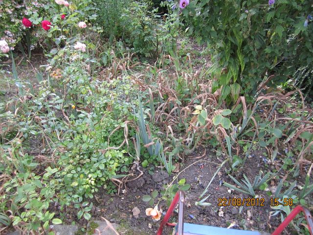 iris fanés, pissenlits, , herbe aux goutteux, etc.., rosiers fanés , repartant timidement !! l'horreur ! mais bon ! !! de quoi faire rire les moqueurs, consoler ceux qui sont dans le même cas et encourager ceux dont l'aspect n'est pas aussi moche !! on y arrivera.