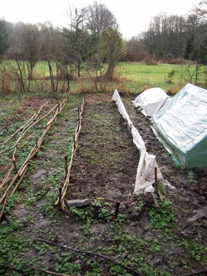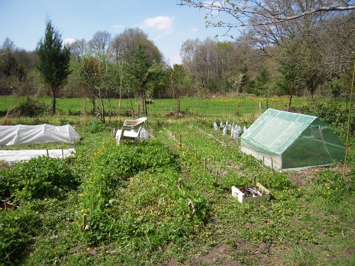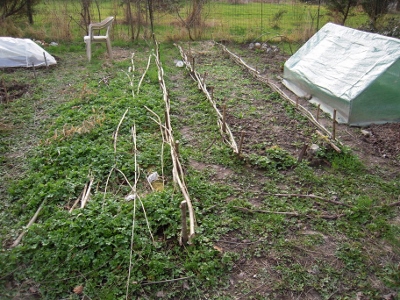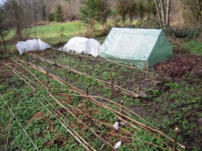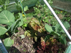 Sous la mini-serre (bien efficace finalement): fèves aguadulce, pois, et 3 choux cabus et quelques salades (plantés à l'automne) En dehors: salades, 2 choux, 3-4 bettes (replantés à l'automne), et petits pois.