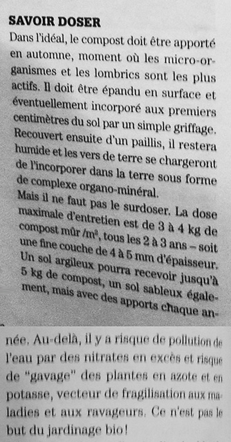 C'est très technique, trop pour moi qui n'ai qu'un petit potager (15-20m²) dans lequel je plante et sème très serré (l'an dernier, 10 plants de tomates, 3 plants de courgettes, 3 poivrons, une verveine citronnelle, et de l'oseille repiquée il y a 4 ans ; les petits fruits se trouvent ailleurs et je ne leur mets pas de compost).