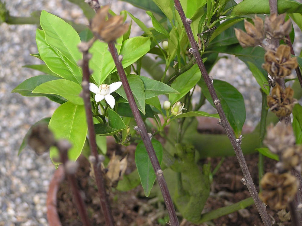 voici mon oranger en fleur à travers les branches de l'althéa, preuve que nous sommes bien en hiver