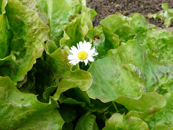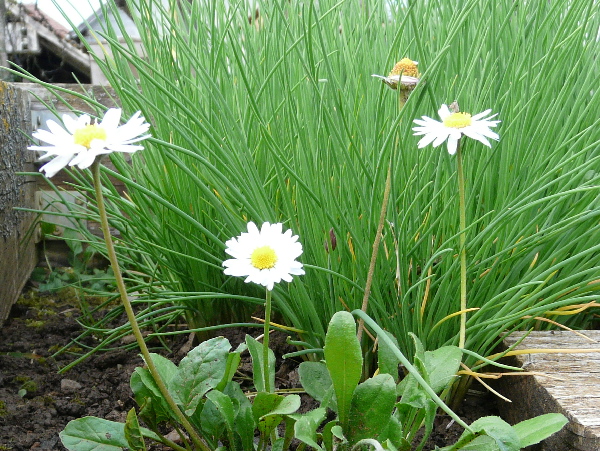 Tout compte fait, la pâquerette en adventice n'est pas si rare : une bien cachée dans les salades spontanées et une autre fait la belle devant la ciboulette !