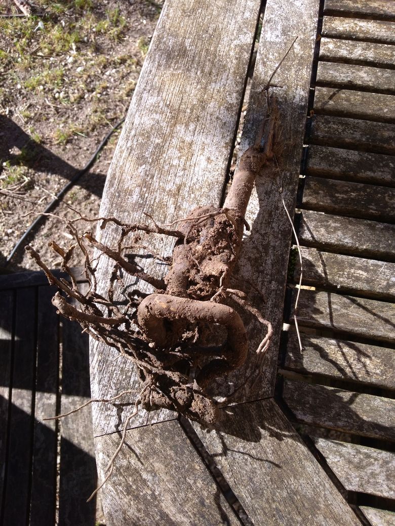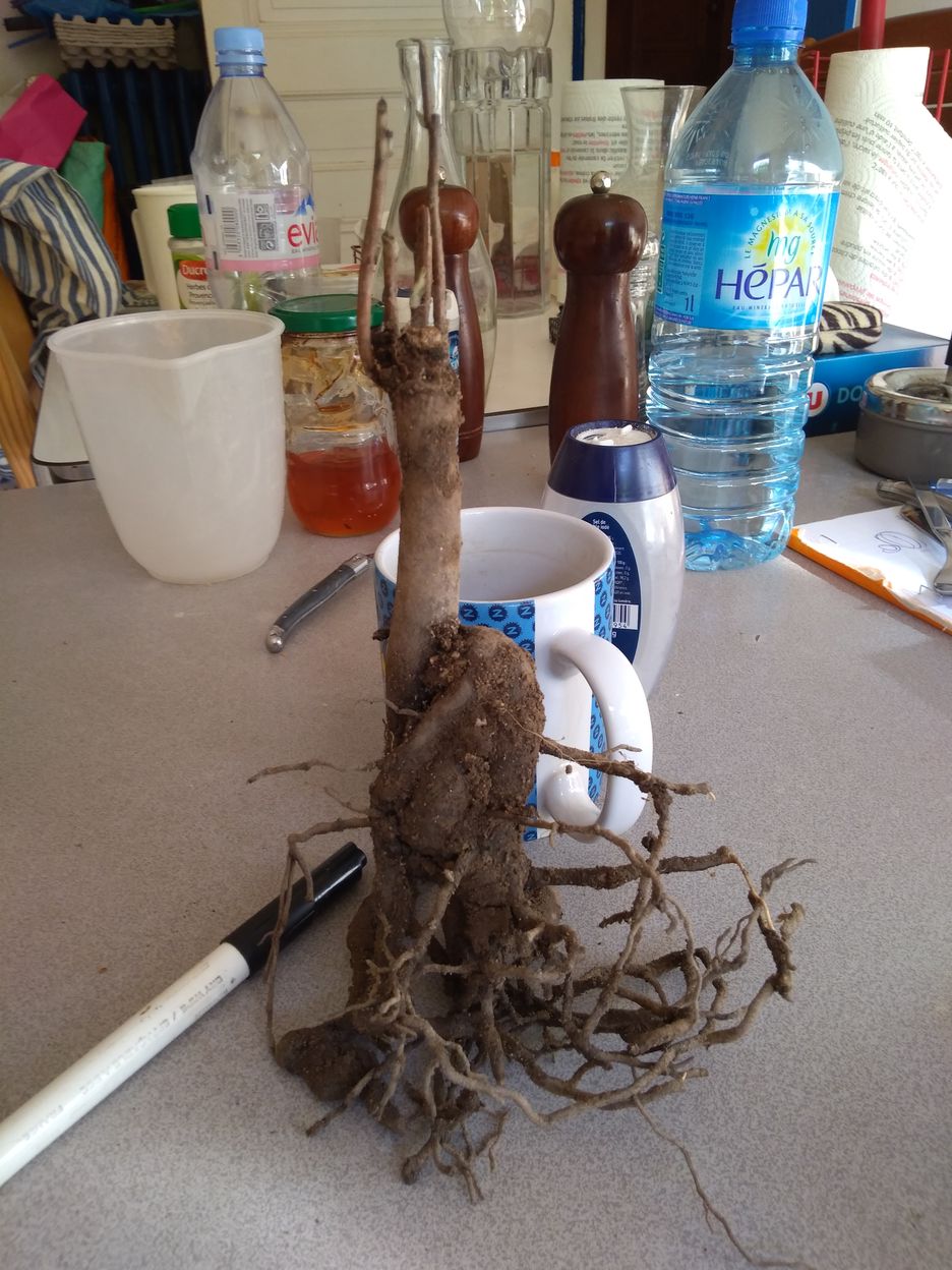 comme il fait quand même de petites pousses (au dessus le tronc est mort, greffe ?) je l'ai installé dans un coin du potager, on verra