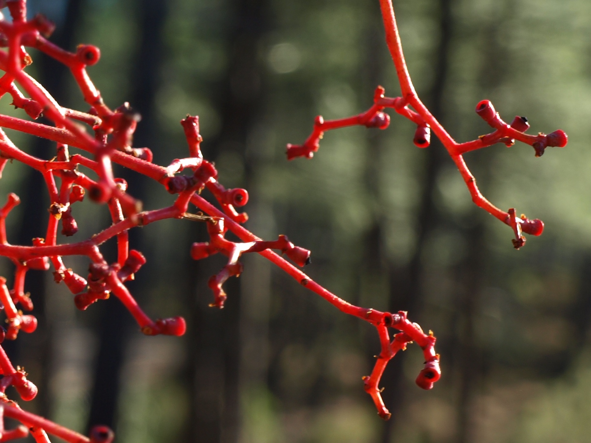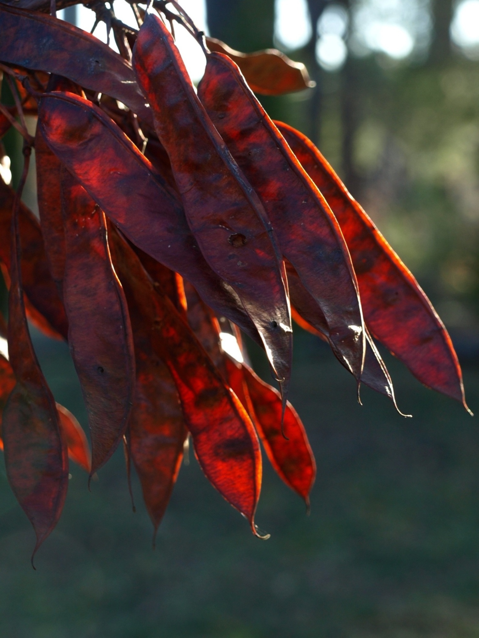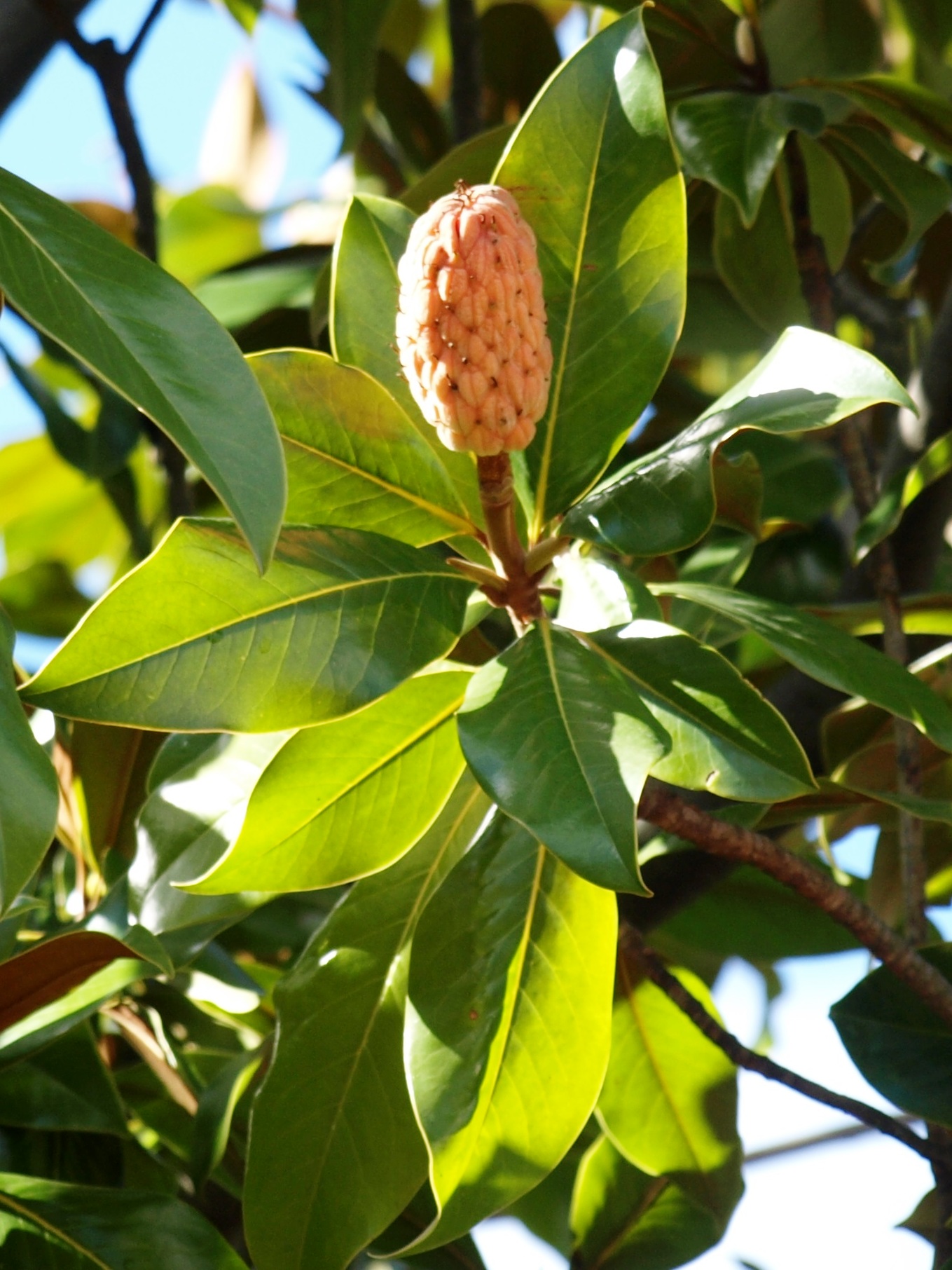 Fruit de Magnolia grandiflora, encore rose du plaisir d'avoir offert ses dernières graines.