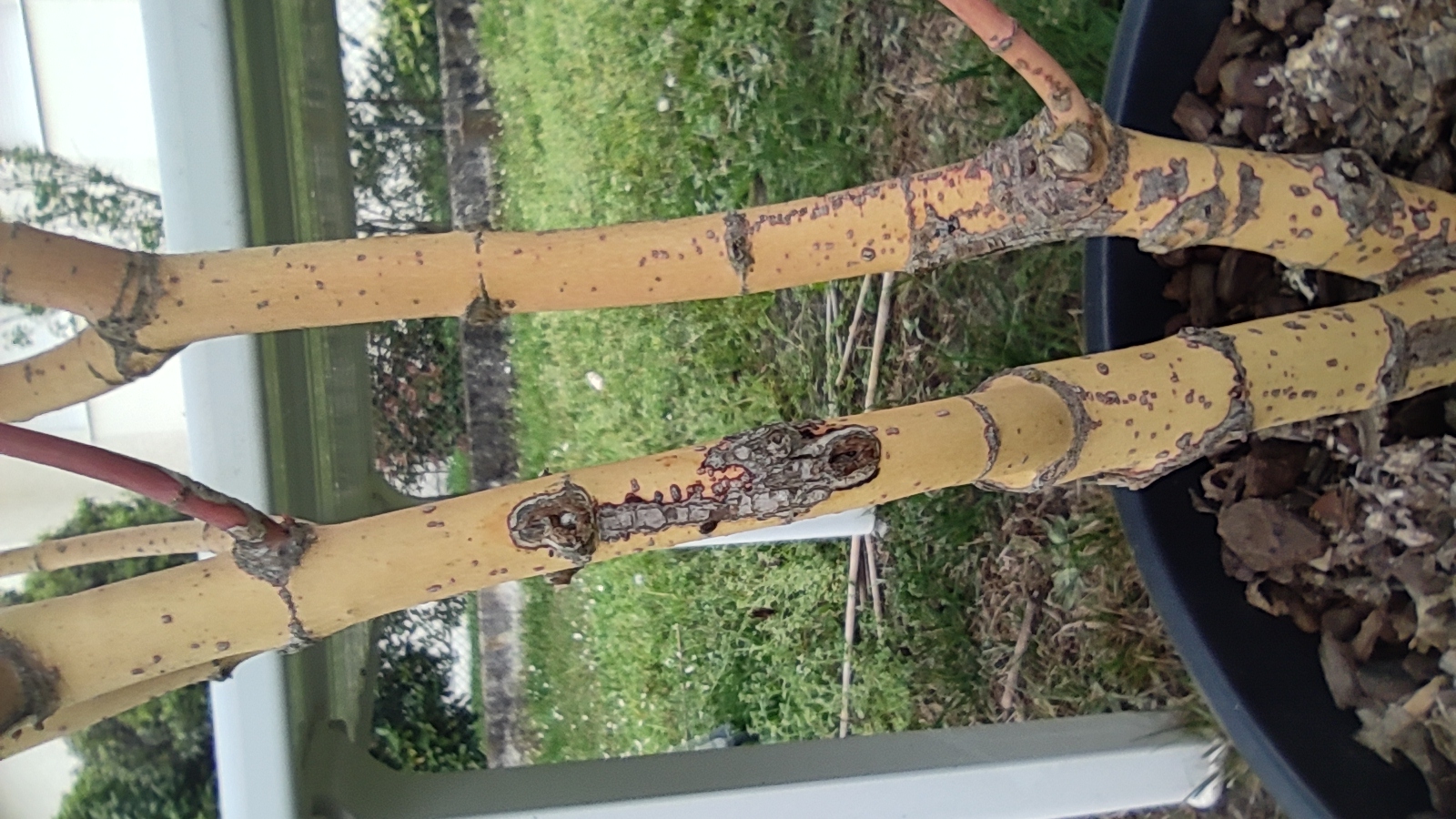 2019 debourre normalement mais rapidement des tâches noires apparaissent un peu partout sur le tronc, les feuilles au dessus scortche. En moins d une semaine les tâches explosent, le bois devient sec au dessus des tâches. J inspecte les racines tout nickel. Je coupe au max mais comme il y a des tâches presque partout je ne me résout pas de couper juste pour garder 10 cm au dessus de la greffe. Je décide de laisser 60cm, et d enlever le max de brindille pour dégager le tronc. Fin avril les tâches continuent à grossir et les feuilles debourrent mal. Je baisse les bras, le laisse dans un coin et le rempote dans un pot conique en attendant pour récupérer le air pot. Inspection des racines tout nickel. Finalement il végète puis fait qqs jets en été. Je décide de garder ces jets pour lui garder un peu de biomasse